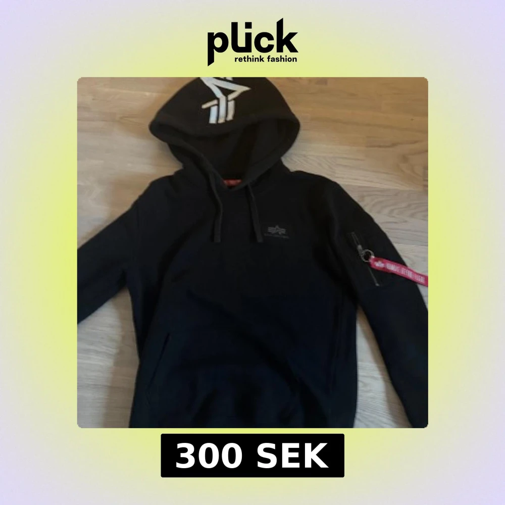 Svart hoodie från Alpha Industries med stor vit logga på ryggen och mindre logga på huvan. Klassisk känguruficka, snörning i huvan och ikonisk röd 'Remove Before Flight'-tag på ärmen. Mjuk bomullsblandning och dragkedjeficka på ärmen för extra attityd.