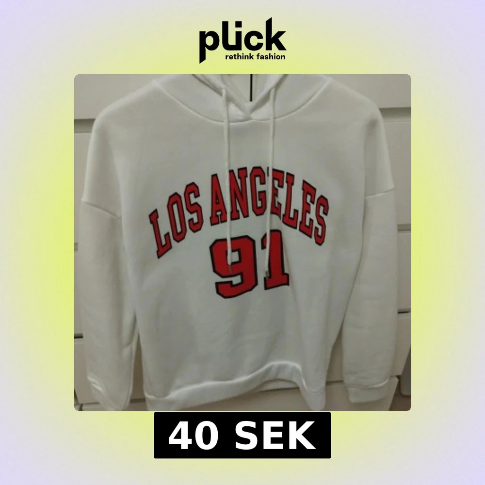 Vit hoodie från SHEIN med trycket 'LOS ANGELES 91' i rött och svart på framsidan. Tröjan har huva med snörning och långa ärmar. Mjuk insida och klassisk passform, perfekt för chill dagar. Storlek S.