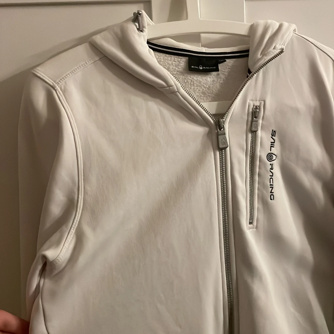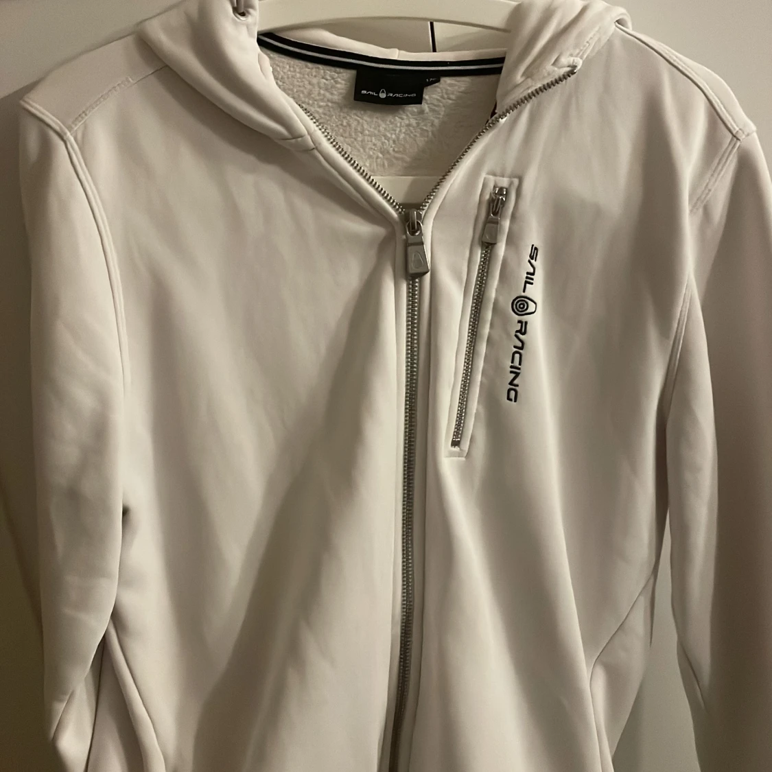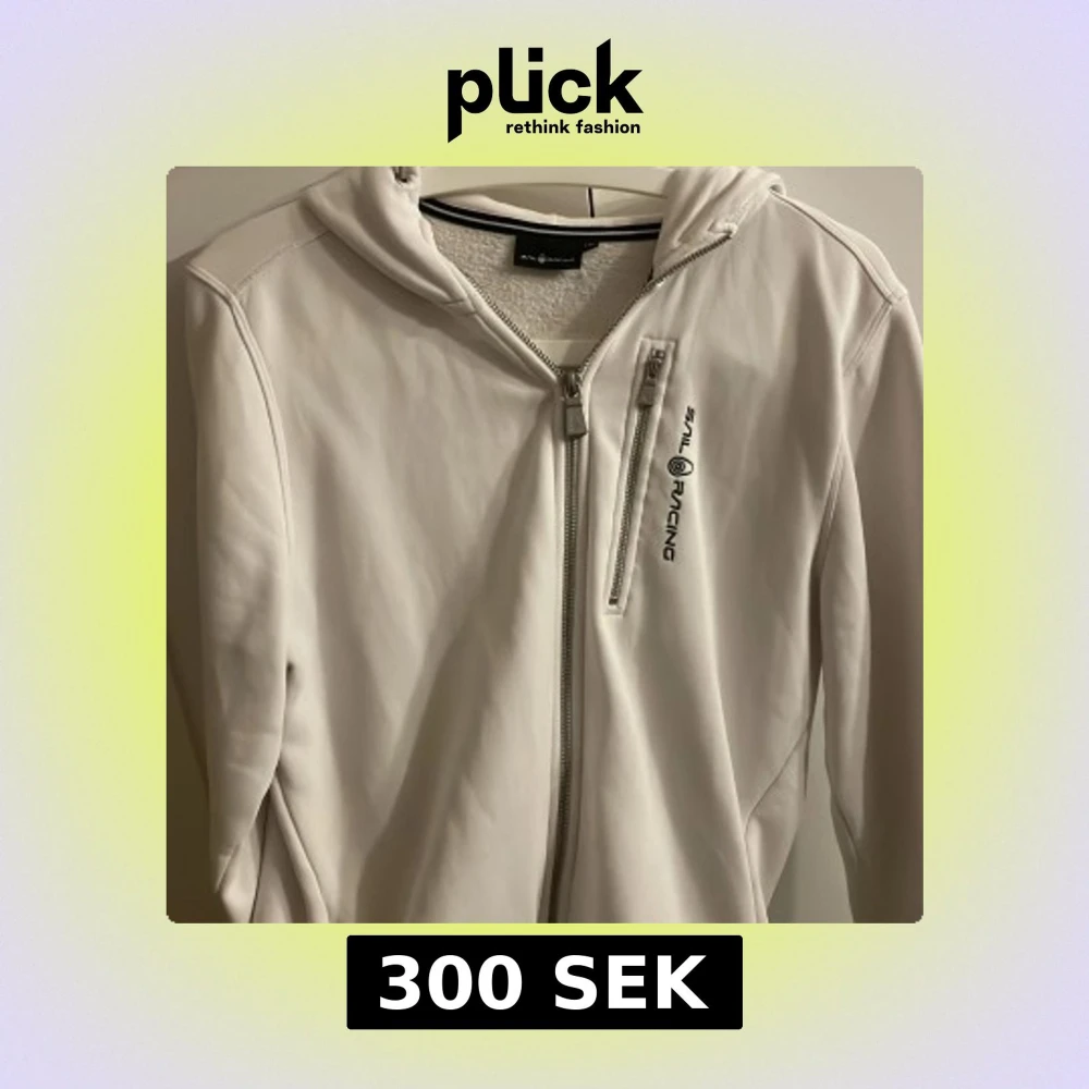 Vit zip hoddie från Sail Racing med huva och dragkedja framtill. Använd ca 3-4 gånger, kommer inte till användning. Den är i storlek 176.,som är ungefär som en M