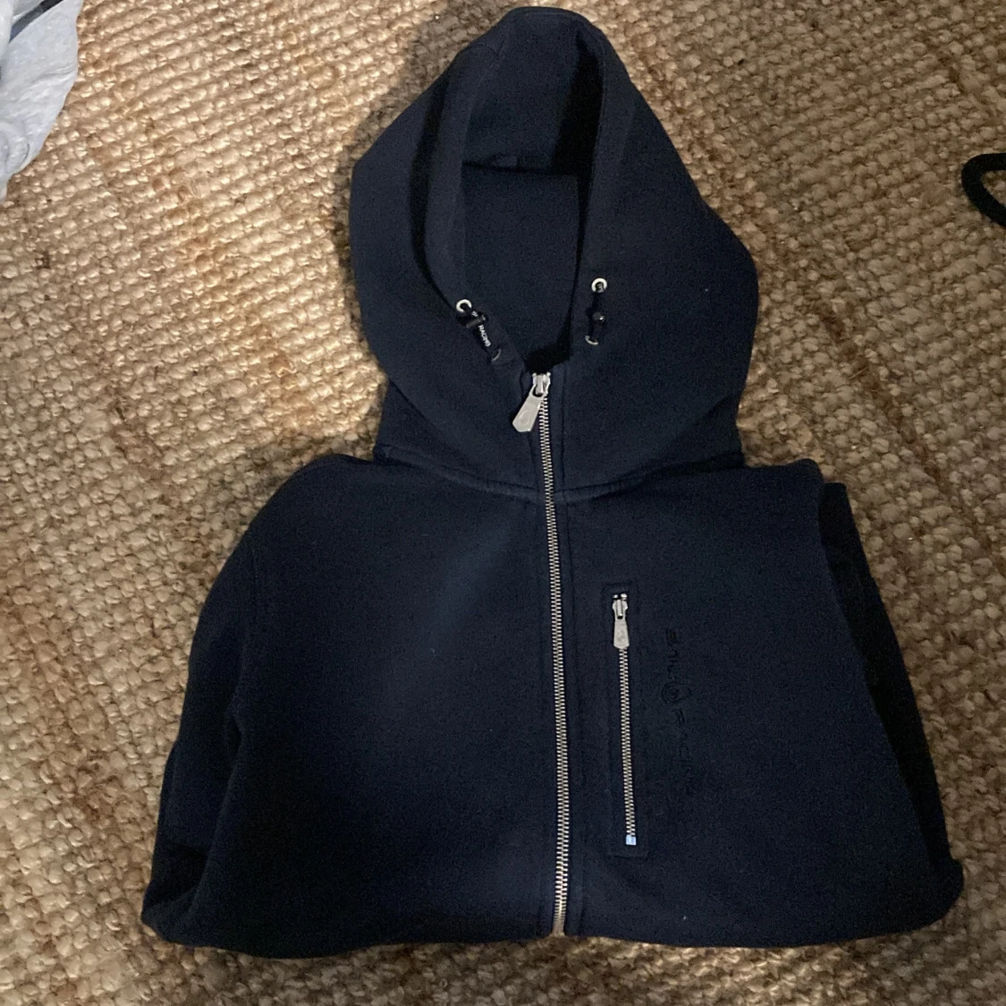 Säljer en svart hoodie från Sail Racing med hel dragkedja och en extra dragkedjeficka på bröstet. Tröjan har huva med snörning och är tillverkad i mjukt material, perfekt för kyliga dagar. Enkel och stilren design med diskret logga på bröstet.
