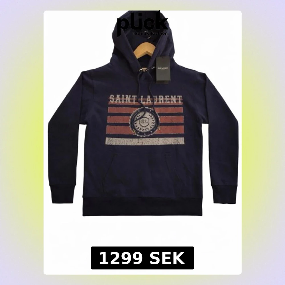 En skitsnygg saint Laurent hoodie i marinblå färg, helt oanvänd med tags kvar. Storlek S och passar slim fit. Tog bort bakgrunden på alla bilder med hjälp av chat gpt så det kanske blev något fel men skriv för mer information eller fler bilder!