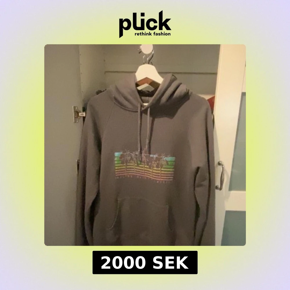 Säljer en snygg grå hoodie från Saint Laurent med ett färgglatt tryck av palmer och texten 'Malibu Saint Laurent' på framsidan. Hoodien har en klassisk passform med långa ärmar. Har annat som hägrar kan prisförhandla