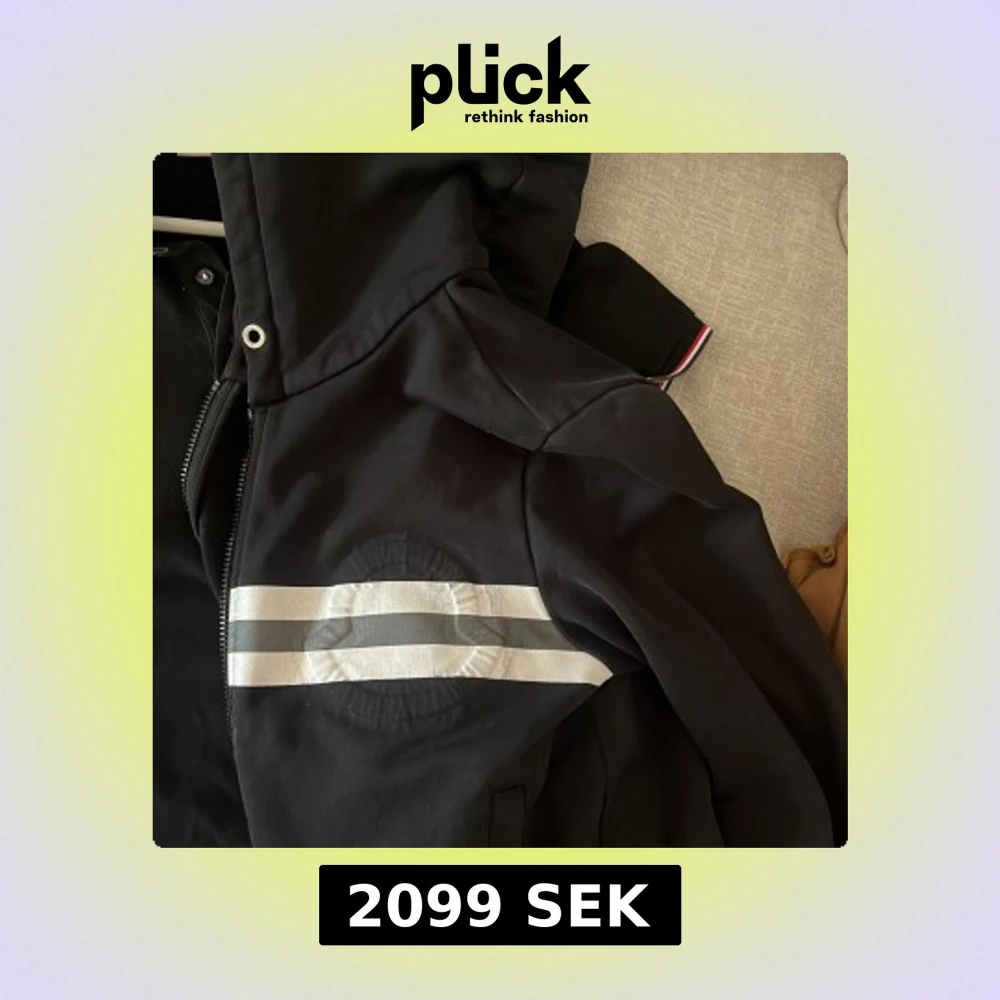Säljer en stilren svart jacka från Moncler med huva och dragkedja. Jackan har två vita ränder på ärmen och ribbade muddar. Perfekt för en cool och avslappnad look.