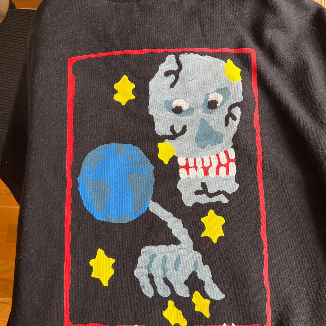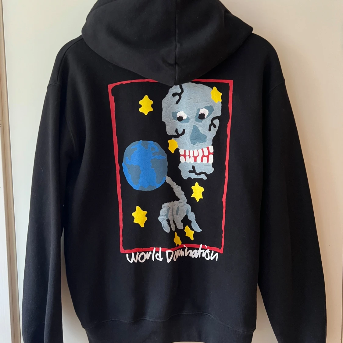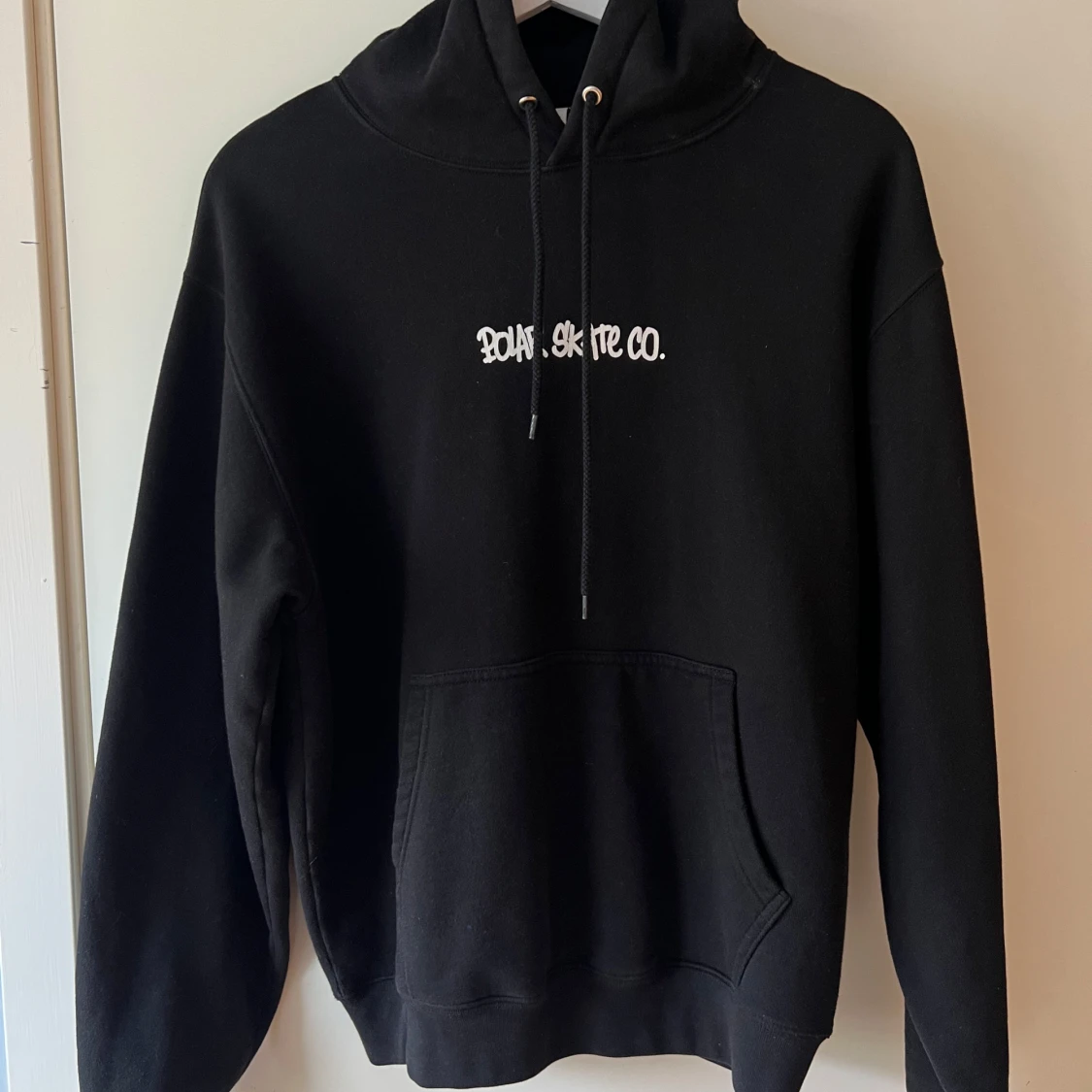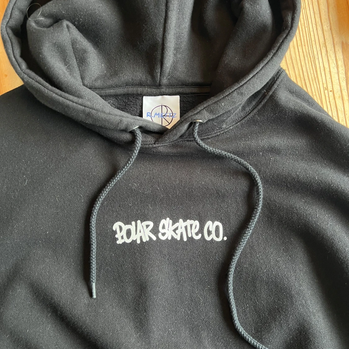 Svart hoodie från Polar Skate Co. med vit logga framtill och stor färgglad grafik på ryggen. Tröjan är i mycket bra skick och är perfekt för dig som skejtar. Tröjan tillverkas inte längre. Om du har några frågor är det bara att skriva.