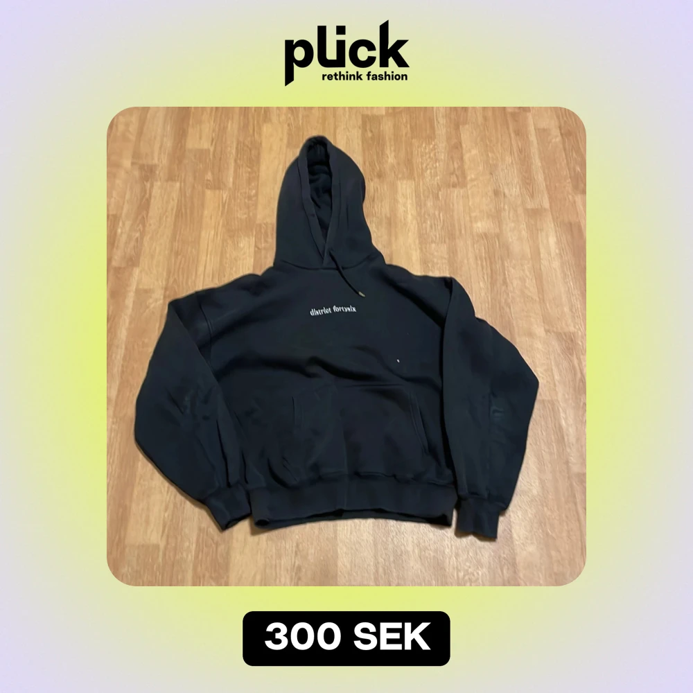 Säljer en svart hoodie från District Fortysix med en cool design på baksidan. Den har en stor ficka fram och en bekväm huva. Perfekt för höst och vinter, och passar till alla casual outfits. Skön och stilren!