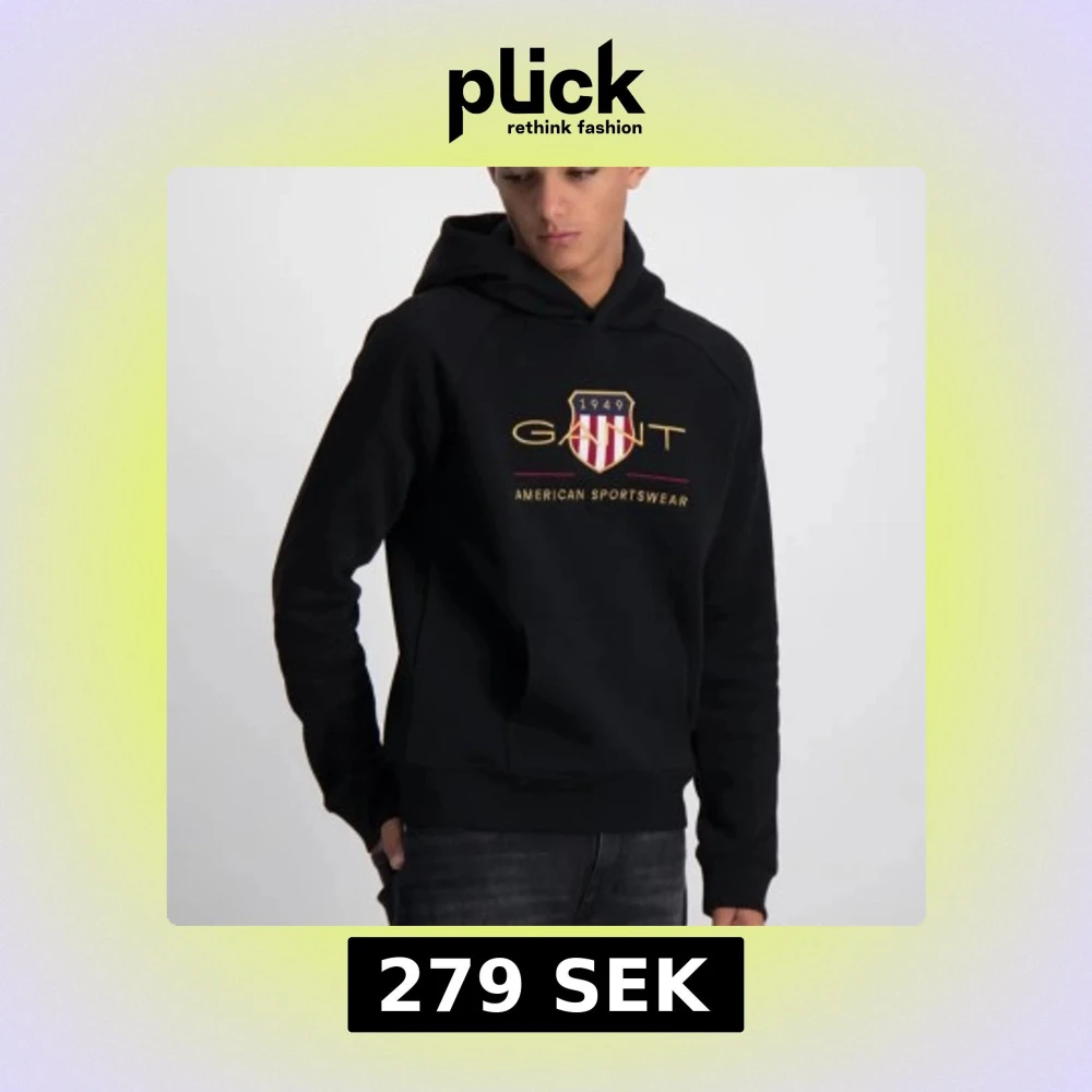 Svart hoodie från GANT med stort broderat logotyp-tryck och sköld på bröstet. Klassisk känguruficka framtill, huva och långa ärmar. Mjuk insida och sportig vibe, perfekt för chill dagar. Snygga detaljer i guld och rött på trycket. Säljer då min lillebror fick den i julklapp men han har aldrig använt den