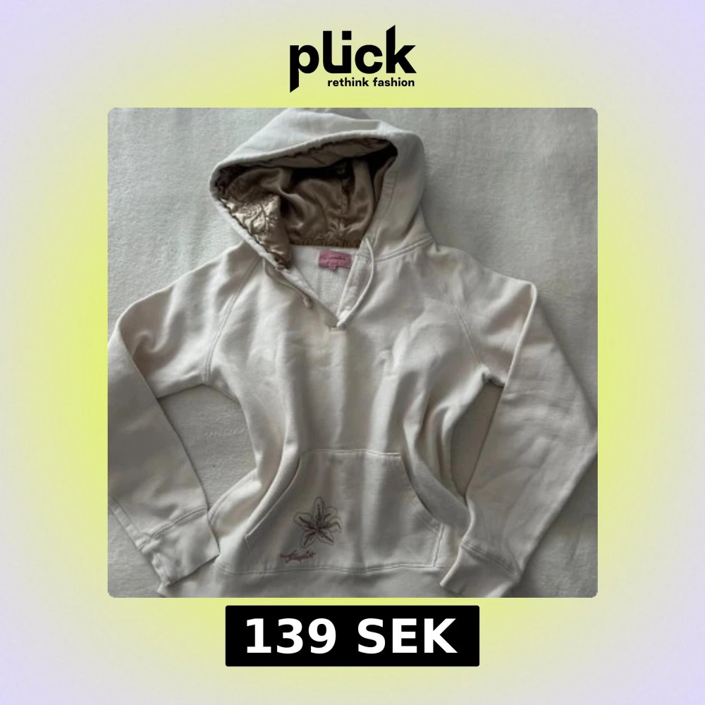 Snygg krämvit hoodie från Freespirit med blommigt broderi på fickan och insidan av huvan i glansigt material. Huvan har coola broderade detaljer och tröjan har en klassisk känguruficka. Perfekt för dig som gillar unika detaljer och mjuka material. Den är storlek 14 (ca 164 i barnstorlek), men passar storlek xs-s.