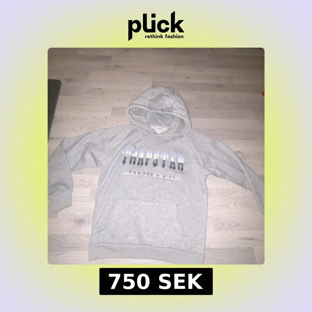 Säljer en grå hoodie från Trapstar med texten 'It's a Secret' tryckt på framsidan. Hoodien har en klassisk design med känguruficka och justerbar huva. Perfekt för en avslappnad stil.