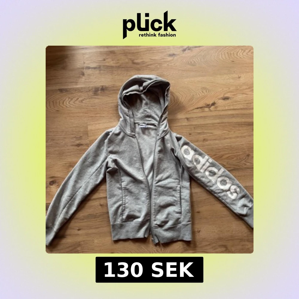 Grå hoodie från Adidas Essentials med dragkedja och huva. Stor Adidas-logga i vitt längs ena ärmen. Perfekt för en sportig och avslappnad stil. Mjuk bomullsblandning och två fickor framtill.