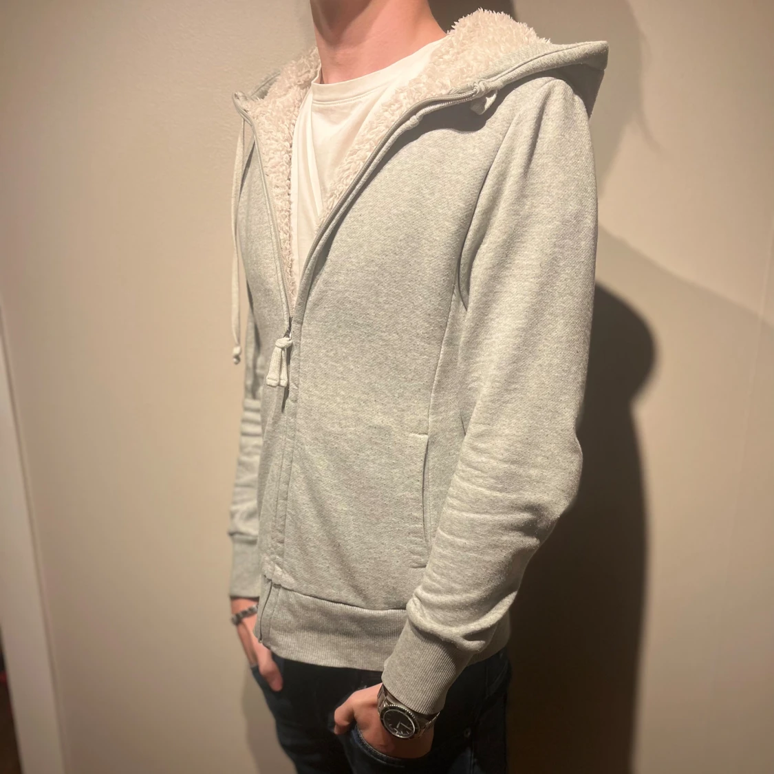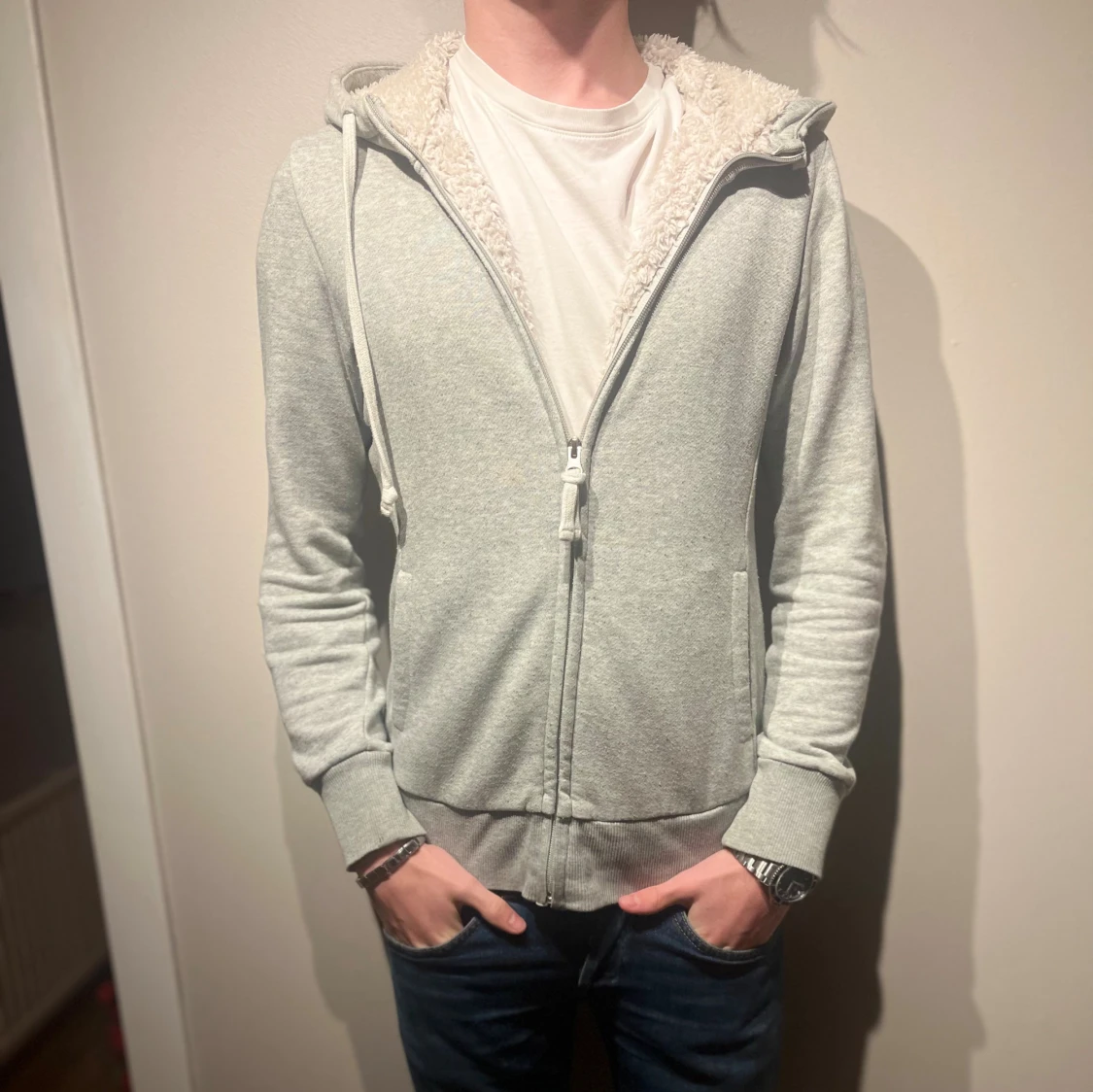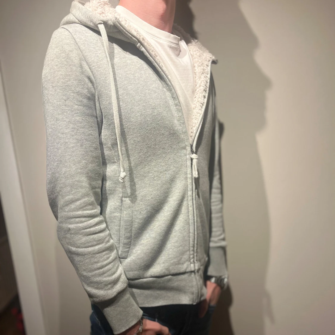 Fodrad Hoodie med vit päls på insidan🙌 Storleken är S📏Hoodien är ifrån Uniqlo och färgen är grå☑️ Modellen är 177cm och väger 65kg📏 Skriv för mer information✅