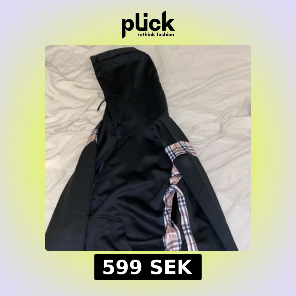 Svart hoodie med dragkedja och huva. Har rutiga detaljer längs ärmarna och insidan av huvan. Aldrig använd. Kan gå ner i pris vid snabbaffär!!!!