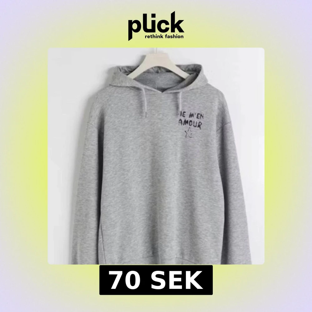Säljer en stilren grå hoodie med texten 'Je m'en amour' och en stjärna tryckt på både fram- och baksidan. Perfekt för en avslappnad look. Hoodien har en klassisk passform med huva och långa ärmar. Xoxo💕