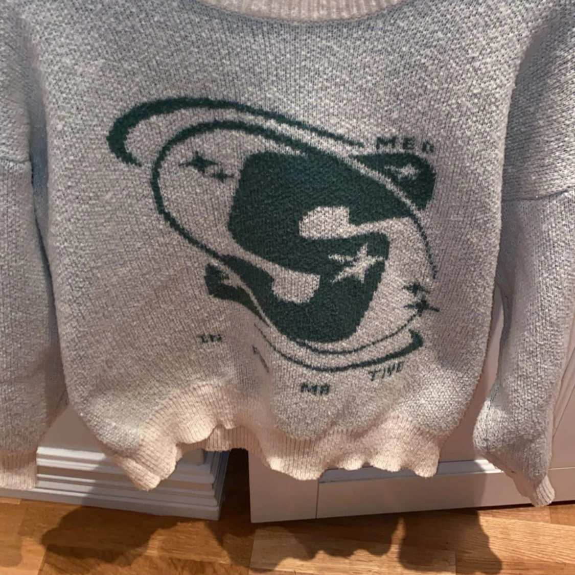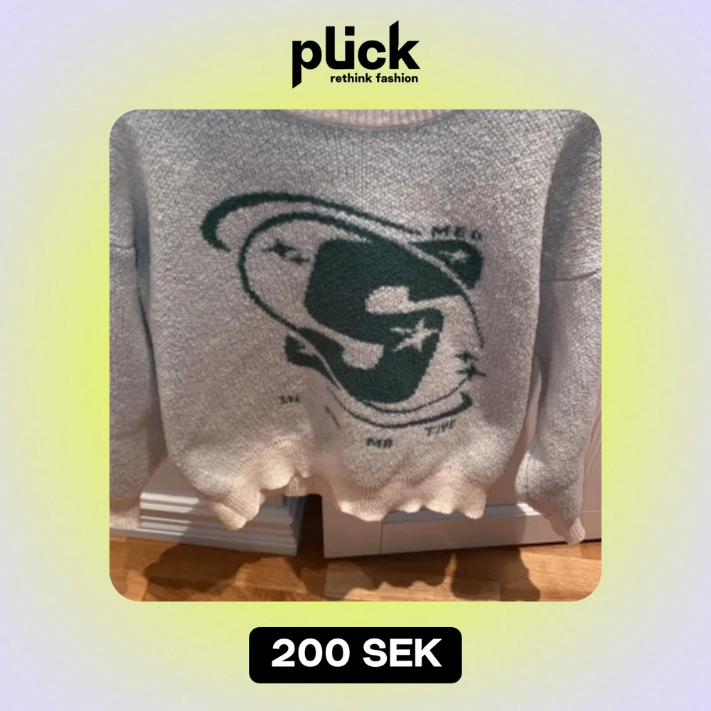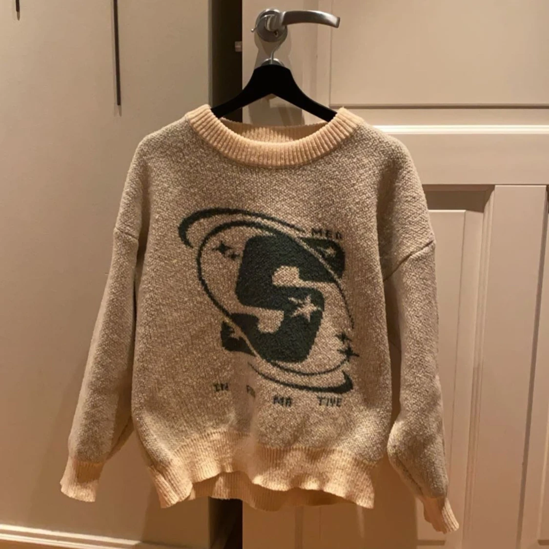 En riktigt snygg stickad tröja med ett fett tryck på magen Den blir lite mer unik med stickad Sitter boxed Tröjan är sand färgad med en mörkgrönt tryck