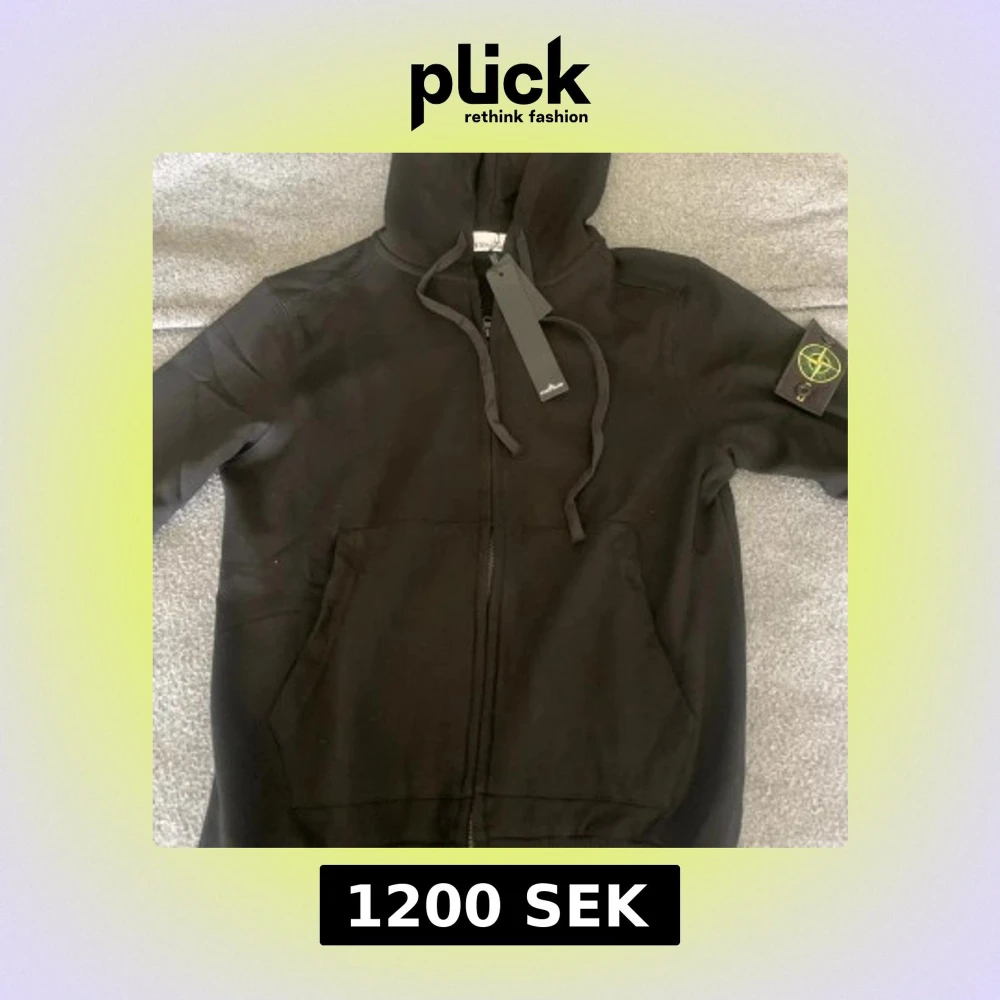 Säljer en svart hoodie från Stone Island med dragkedja och huva. Klassisk logga på ärmen och stora fickor framtill. Perfekt för en stilren och avslappnad look. Materialet är mjukt och bekvämt.