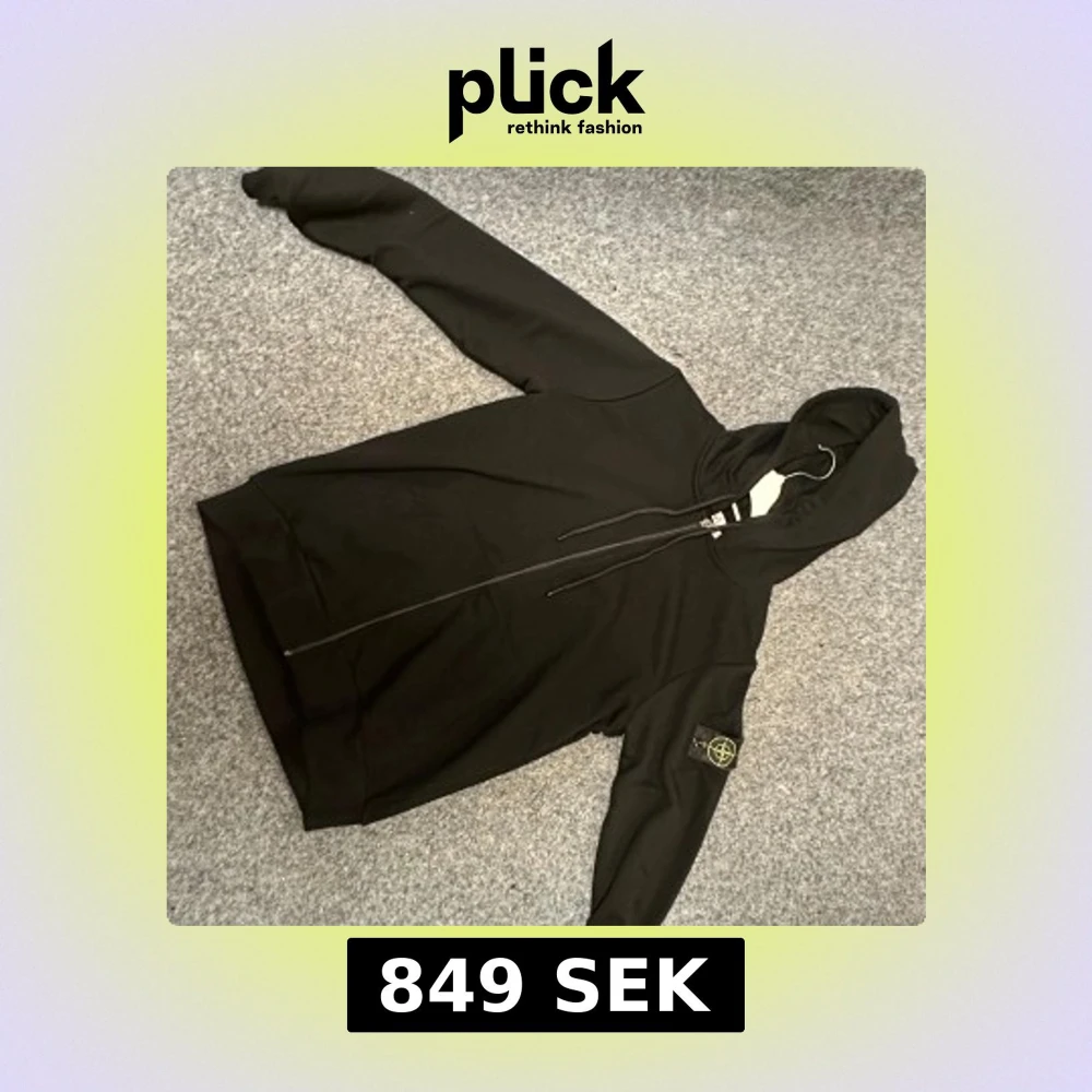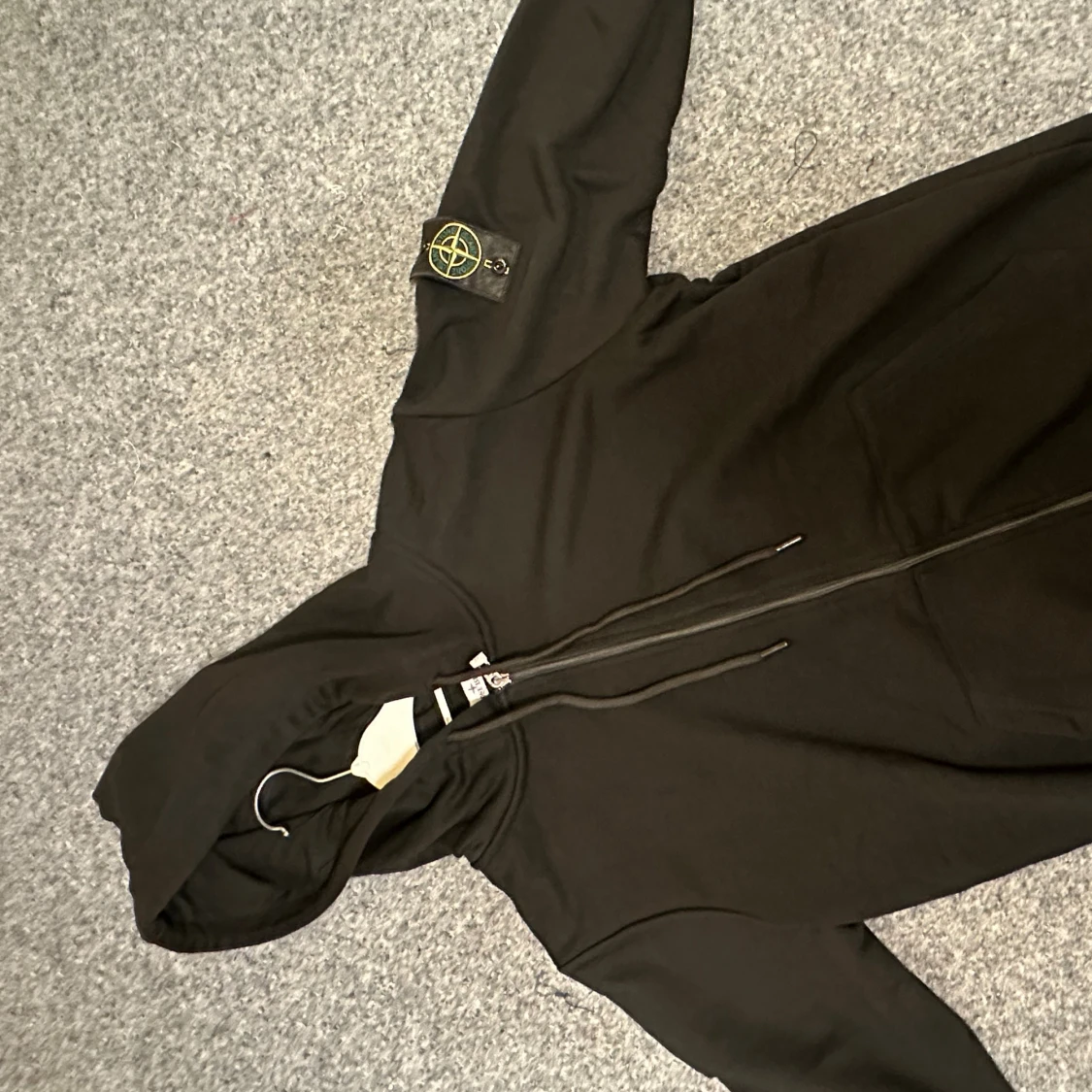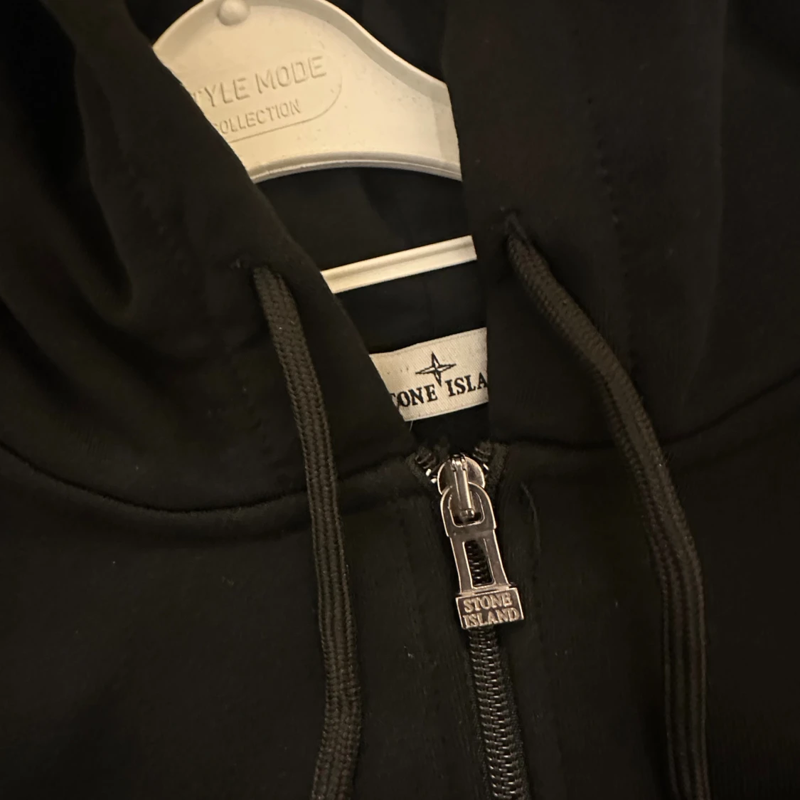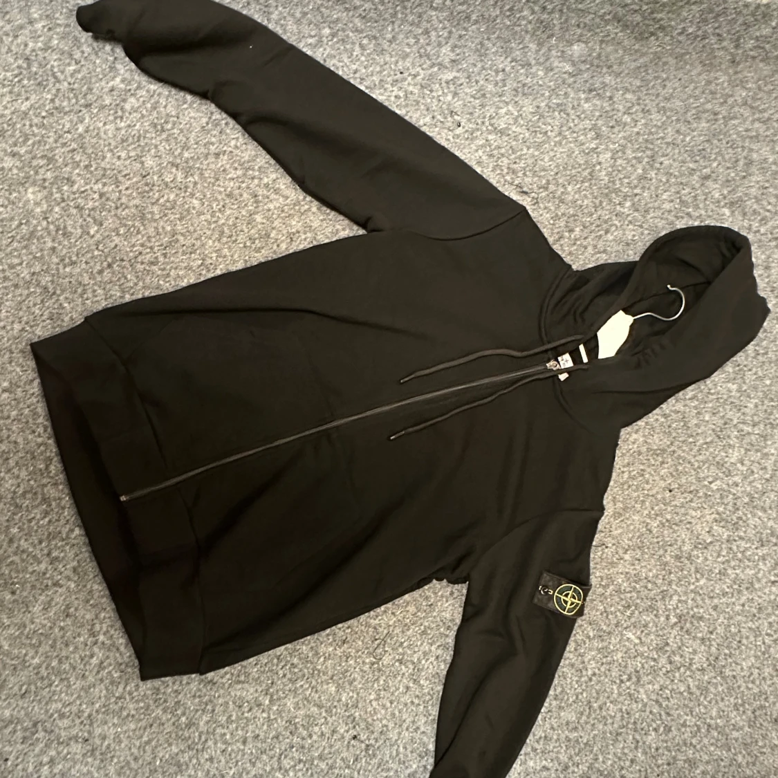 Svart hoodie från Stone Island med klassisk logopatch på vänster ärm. Tröjan har huva med snörning, hel dragkedja framtill och två fickor. Materialet är mjuk bomull och passformen är normal. Perfekt för dig som gillar streetwear och snygga detaljer.