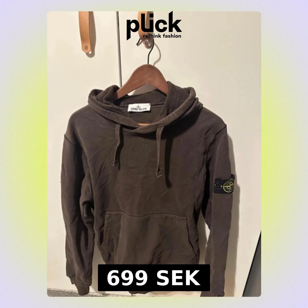 Säljer en mörkbrun hoodie från Stone Island med klassisk logotyp-patch på vänster ärm. Tröjan har huva med snörning, stor magficka och långa ärmar. Perfekt för dig som gillar streetwear och vill ha en clean look med snygga detaljer. Skriv för bild på QR-kod.