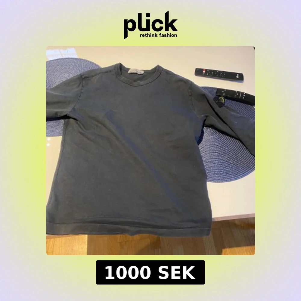 Säljer en stilren svart tröja från Stone Island med deras ikoniska märke på ärmen. Tröjan har långa ärmar och en klassisk rund halsringning. Perfekt för en avslappnad look.