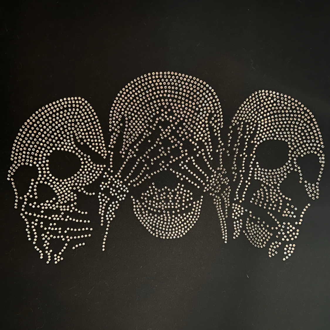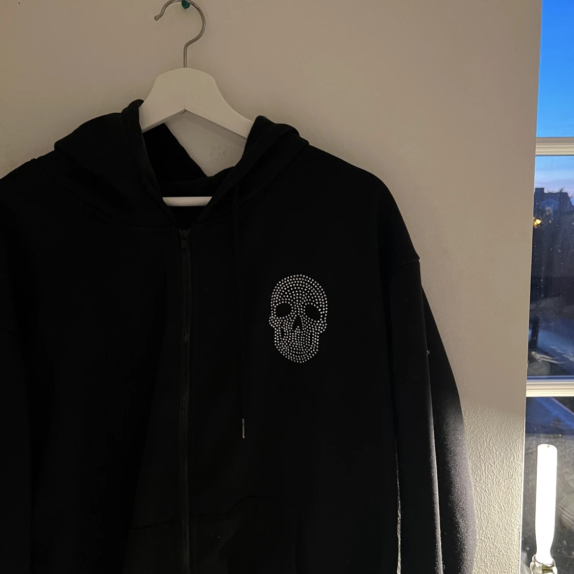 Svart zip hoodie med luva och döskallar i rhinestones där fram och bak. Köpt i secondhand butik och utan lapp så jag vet inte märket. Inga diamanter/stenar saknas! Storlek S men rätt oversize! Passar både killar och tjejer.