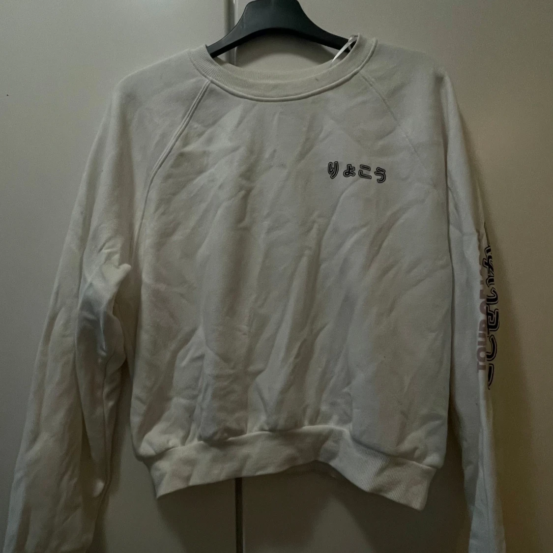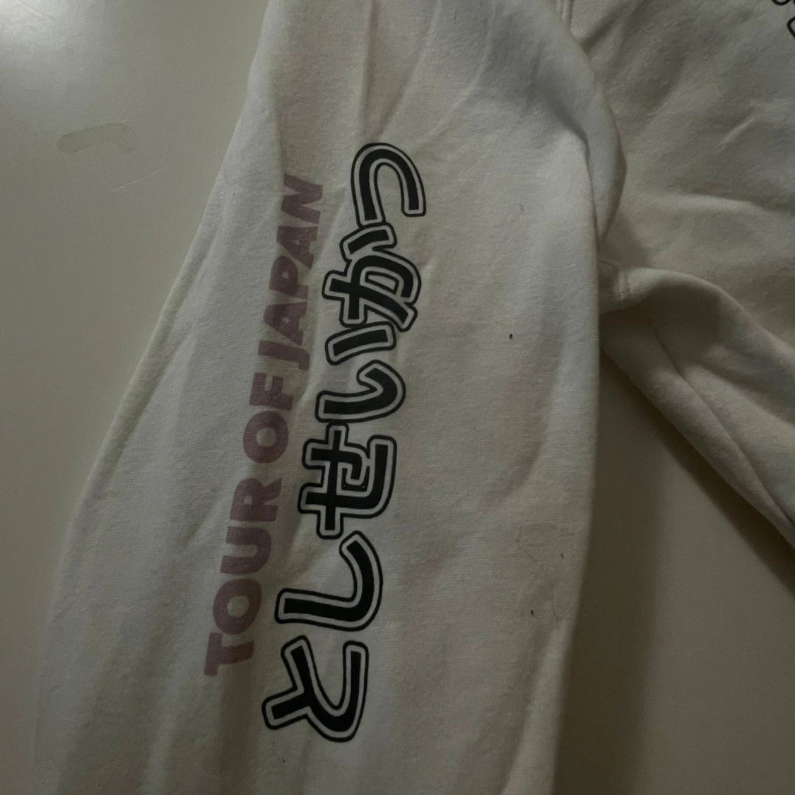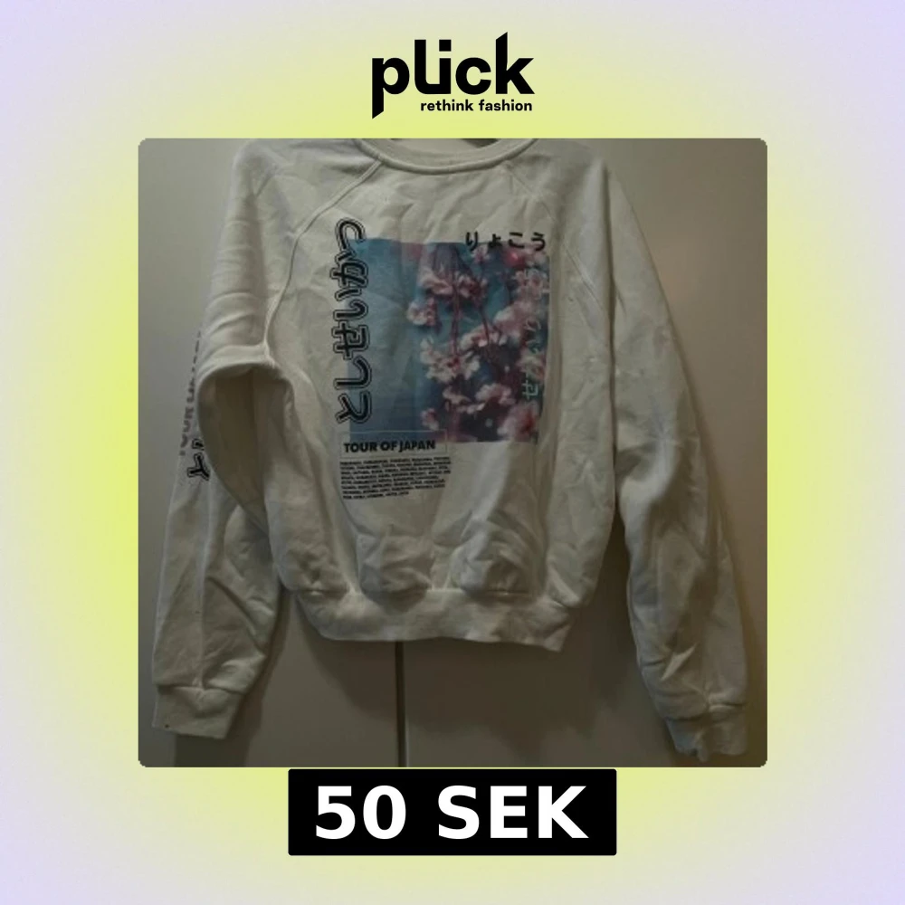 Den är i mycket bra skick men skrynklig. Vit sweatshirt med coolt tryck på ryggen och ärmen, inspirerat av Japan och körsbärsblommor. Trycket har japanska tecken och texten 'TOUR OF JAPAN'. Tröjan har rund hals och långa ärmar, perfekt för dig som gillar streetstyle och unika prints.