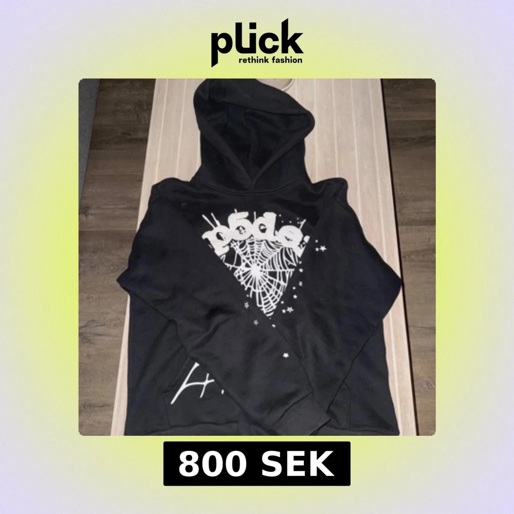Svart Sp5der hoodie med vitt puff print. Tröjan har huva och är bomull med fleece på insidan. Perfekt för dig som gillar streetwear och unika detaljer.