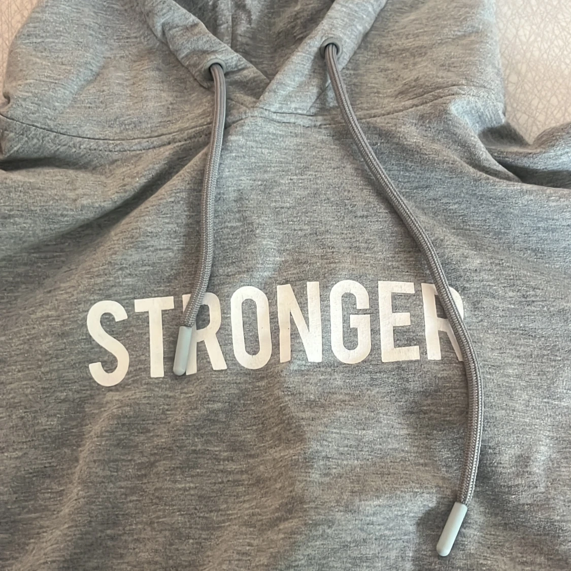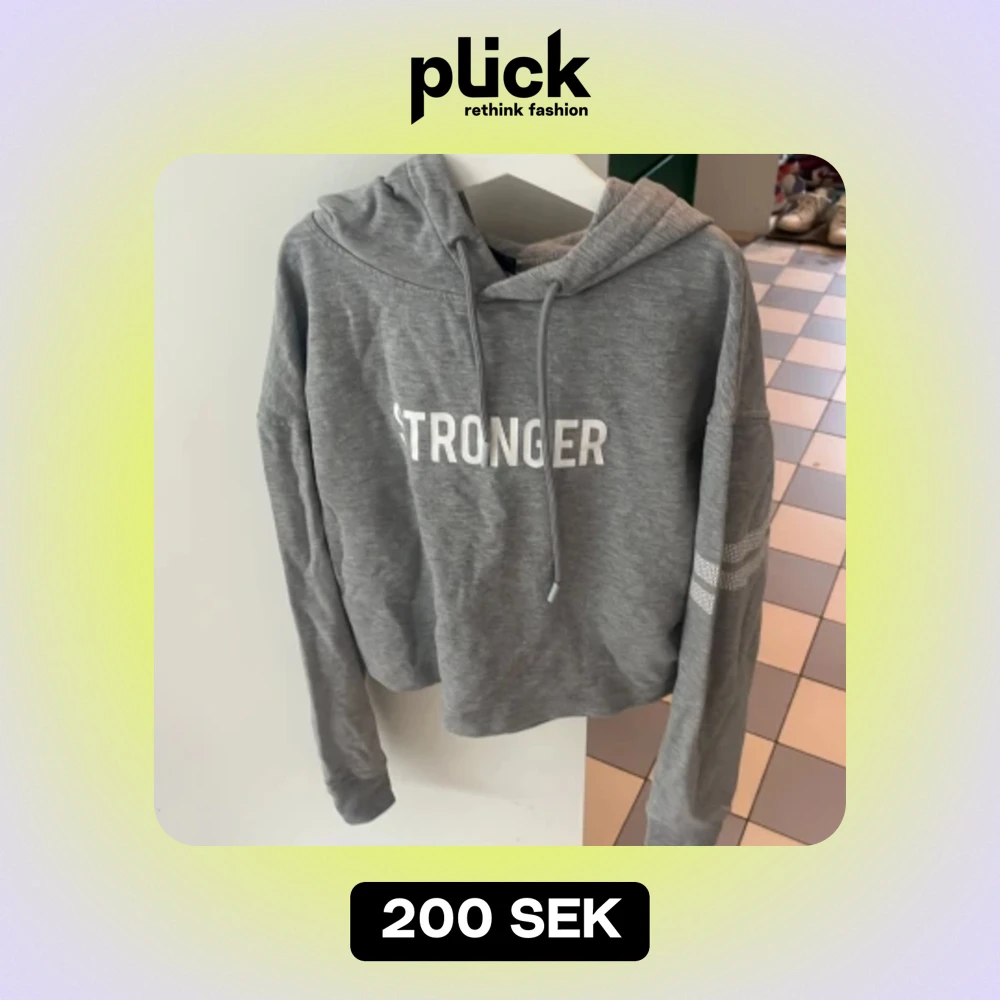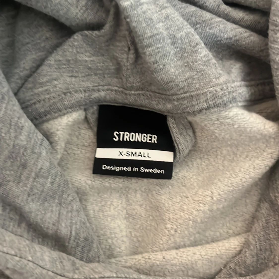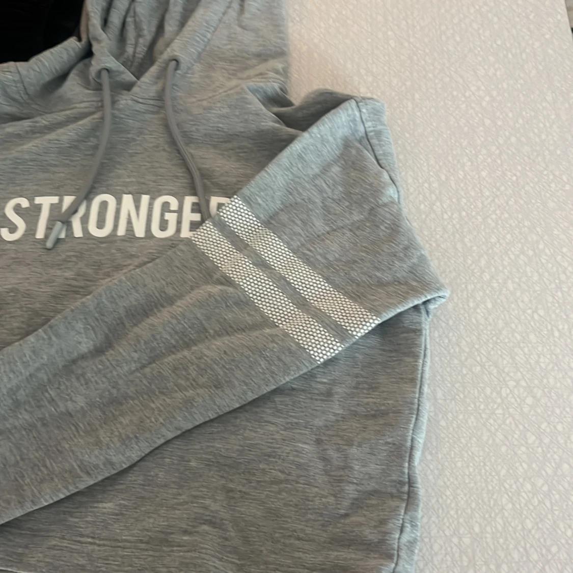 Jag säljer nu denna grå Stronger hoodie. Den är i storlek XS. Tryck på framsidan, vänster ärm. Luva med snören. Knappt använd, väldigt bra skick. KOLLA MIN PROFIL💞