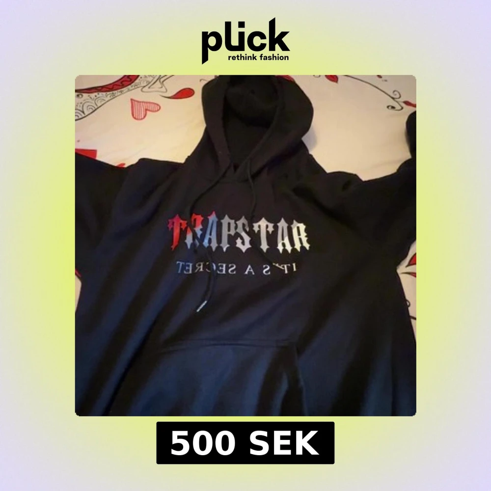 Säljer en svart hoodie från Trapstar med tryck i vitt och rött framtill där det står 'IT'S A SECRET'. Hoodien har huva med dragsko och en stor magficka. Perfekt för dig som gillar streetwear. I have used it 2 times only.