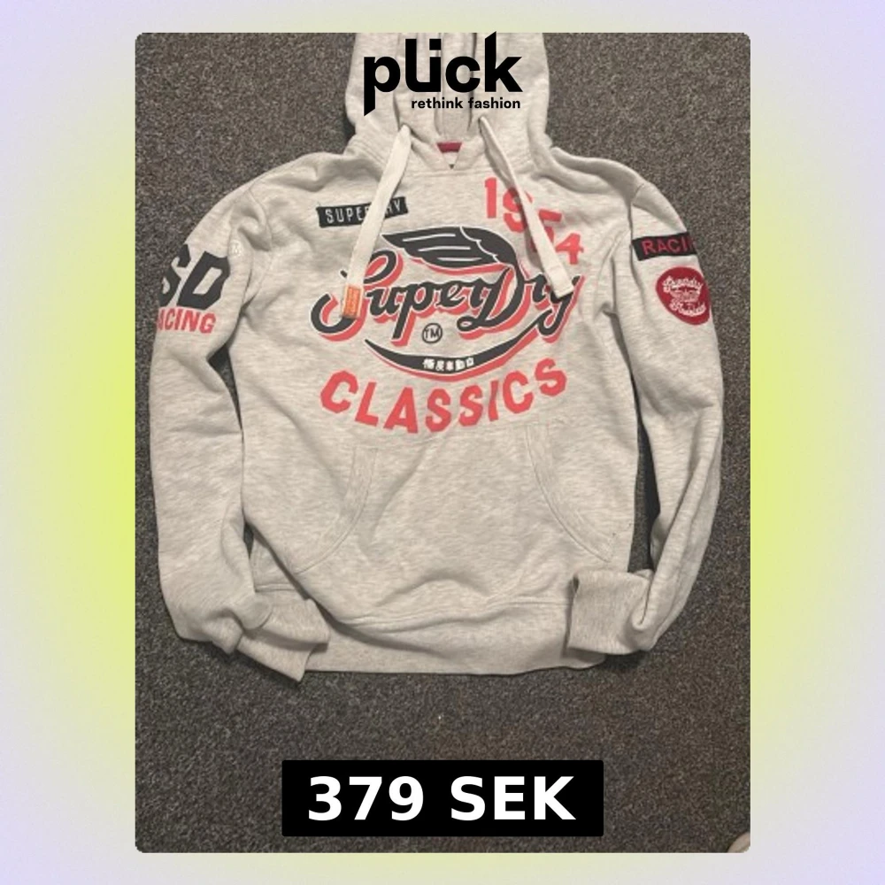 Snygg grå hoodie från Superdry med stora röda och svarta tryck på bröstet och armarna. Klassisk känguruficka framtill, vita dragsnören i huvan och broderade detaljer på ärmarna. Perfekt för en sportig och avslappnad stil. Storlek xs