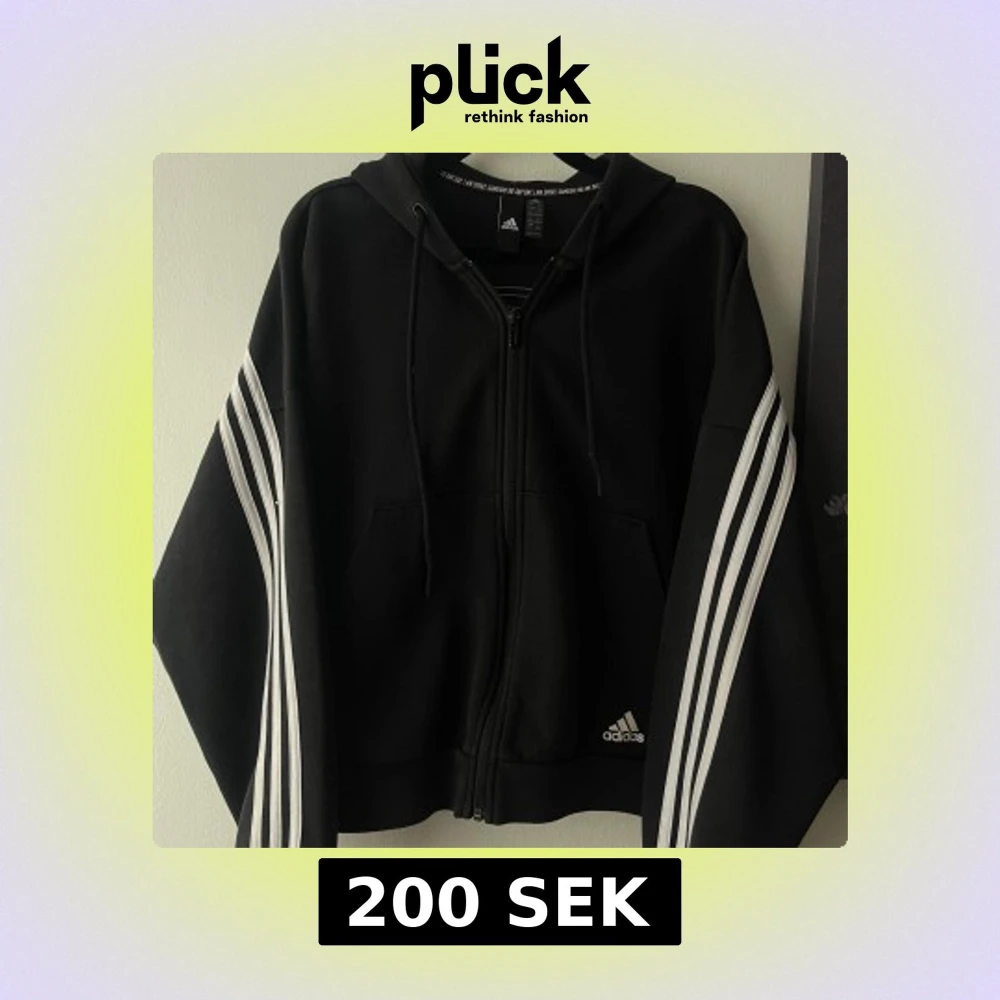 Svart hoodiejacka från Adidas med ränder längs ärmarna och ryggen. Oversized passform. Perfekt för dig som gillar sportig och avslappnad stil.