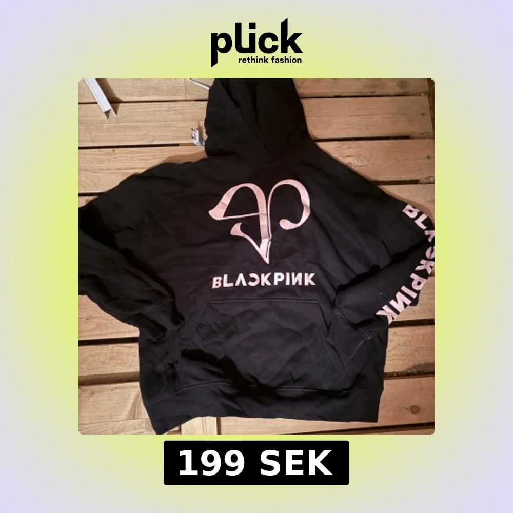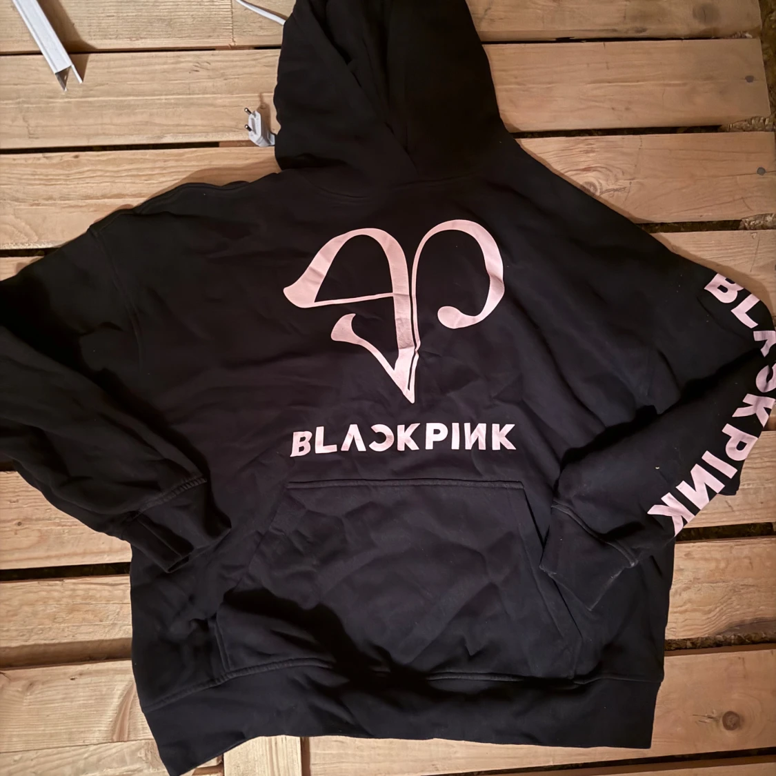Svart hoodie från Divided med stor rosa BLACKPINK-logga på framsidan och tryck på ena ärmen. Tröjan har huva och magficka, perfekt för dig som älskar K-pop och vill sticka ut med snygg streetstyle.