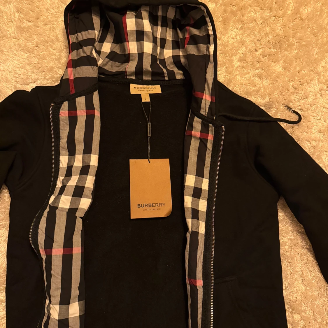 Svart kofta från Burberry med klassiskt rutig insida på huvan och dragkedja framtill. Jackan har broderad Burberry-logga på bröstet och praktiska fickor. Perfekt för dig som vill ha en stilren och ikonisk look.