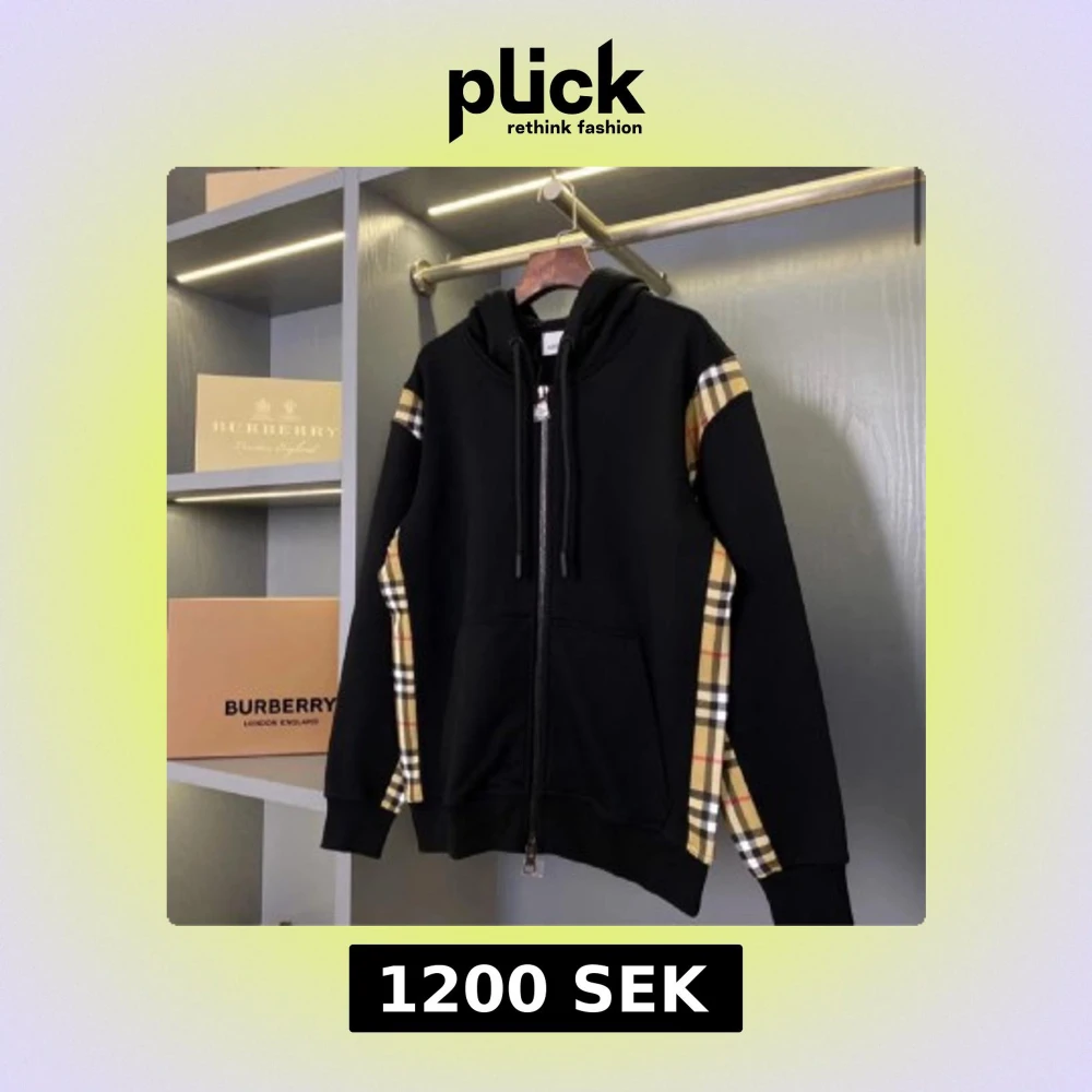Svart hoodiejacka från Burberry med dragkedja och klassiska rutiga paneler längs ärmarna och sidorna. Jackan har huva med dragsko och två fickor framtill. Perfekt för en stilren och trendig look