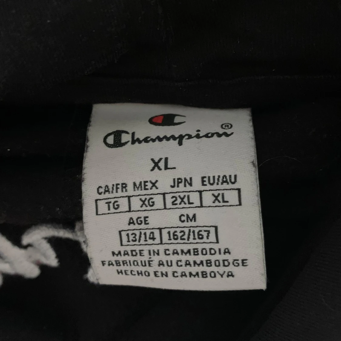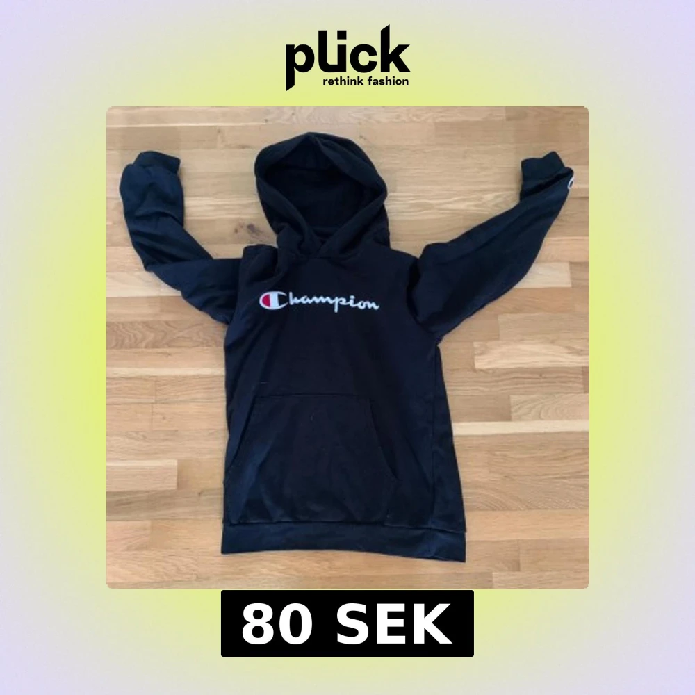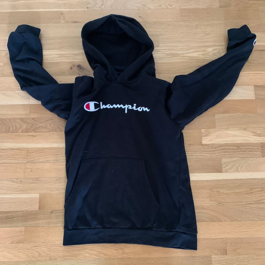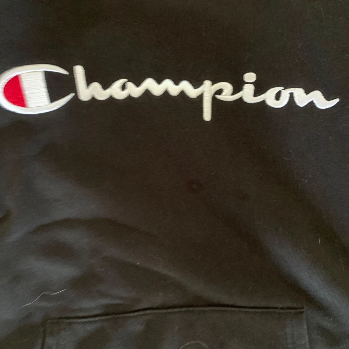 Svart hoodie från Champion i storlek XL med broderad logga på bröstet. Klassisk känguruficka framtill och huva. Perfekt för dig som gillar streetwear och vill ha en enkel men snygg tröja med tydlig branding.