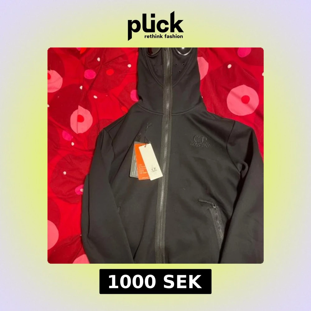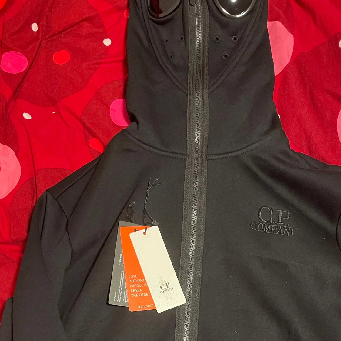 Säljer en svart fullzip hoodie från C.P. Company med unik design. Jackan har en dragkedja framtill och en huva med inbyggda glasögon. Perfekt för en stilren look.