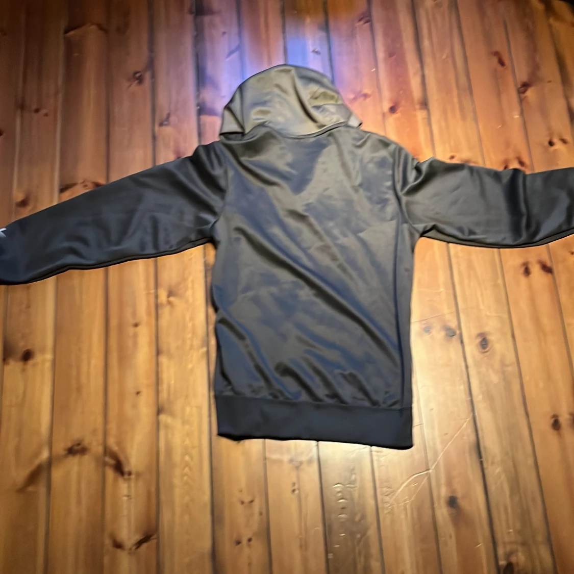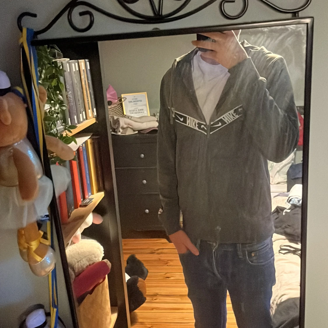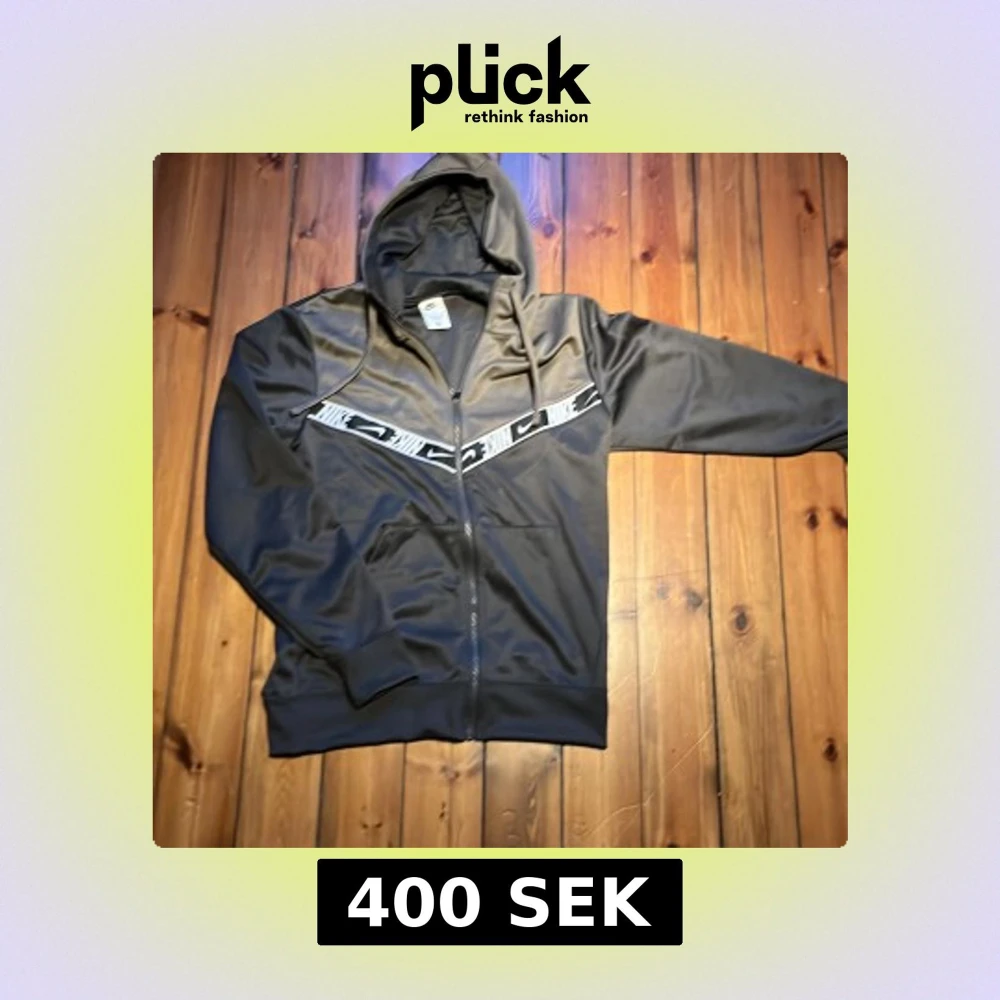 Svart grå zip upp från Nike med hel dragkedja, huva och vita detaljer med Nike-loggor över bröstet. Jackan har två fickor framtill, perfekt för en sportig look. Snygg och enkel att matcha till jeans eller träningsbyxor.