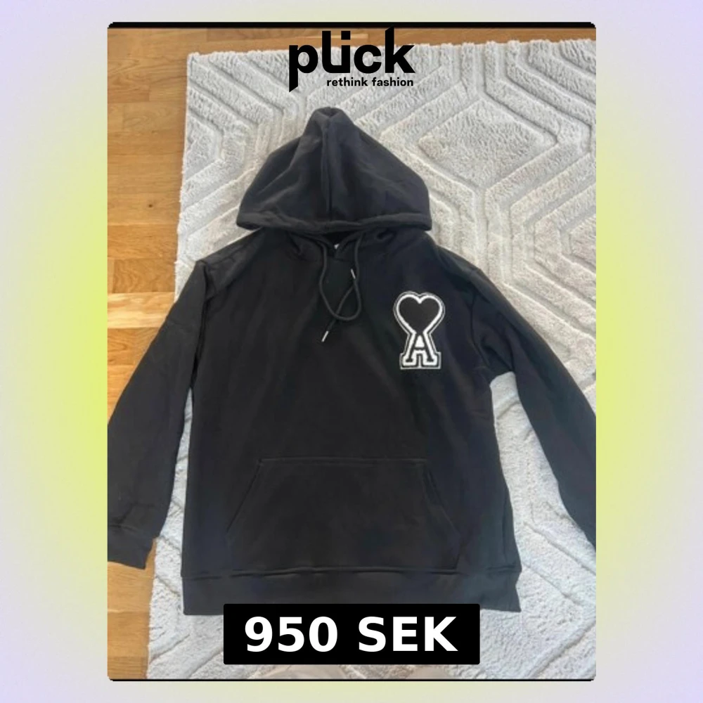 Svart hoodie från Ami Paris i storlek S med stor huva och snörning. På bröstet finns en vit broderad hjärtdetalj med bokstaven A. Tröjan har en klassisk känguruficka och är tillverkad i mjuk bomull. Perfekt för dig som gillar stilrena streetwear-plagg.