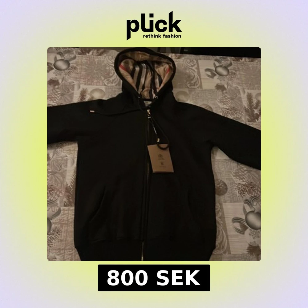 Svart hoodie från Burberry med klassisk randig huva i beige, svart och röd. Jackan har dragkedja framtill, snörning vid huvan och ribbade muddar. Perfekt för dig som vill ha en stilren jacka med lyxig känsla och snygga detaljer.
