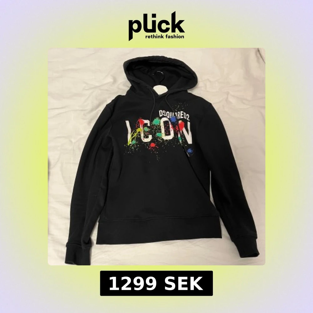 Säljer en svart hoodie från Dsquared2 med färgglatt tryck på framsidan. Hoodien har en klassisk design med dragsko i huvan och ribbade muddar vid ärmslut och nederkant. Perfekt för en avslappnad stil. Pris sänks vid snabbaffär.