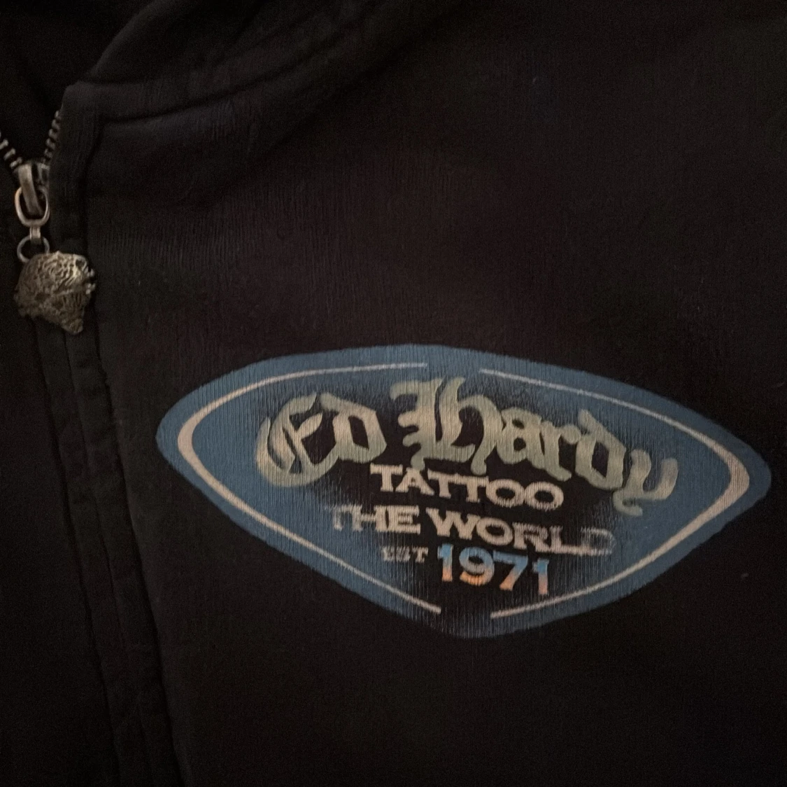 Svart hoodie från Ed Hardy med dragkedja och huva. Tryck på bröstet med texten 'Ed Hardy Tattoo The World Est 1971' och stort färgglatt motiv samt Ed Hardy-logga på ryggen. Perfekt för dig som gillar streetwear och unika detaljer.