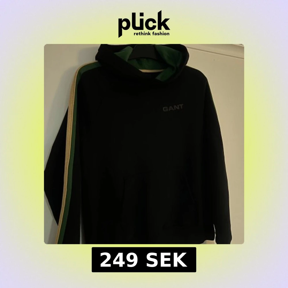 Svart hoodie från Gant med grön/beiga ränder längst armarna. Tröjans huva har en grön insida och är i strl 170/176 Riktigt snygg! Mkt fint skick!