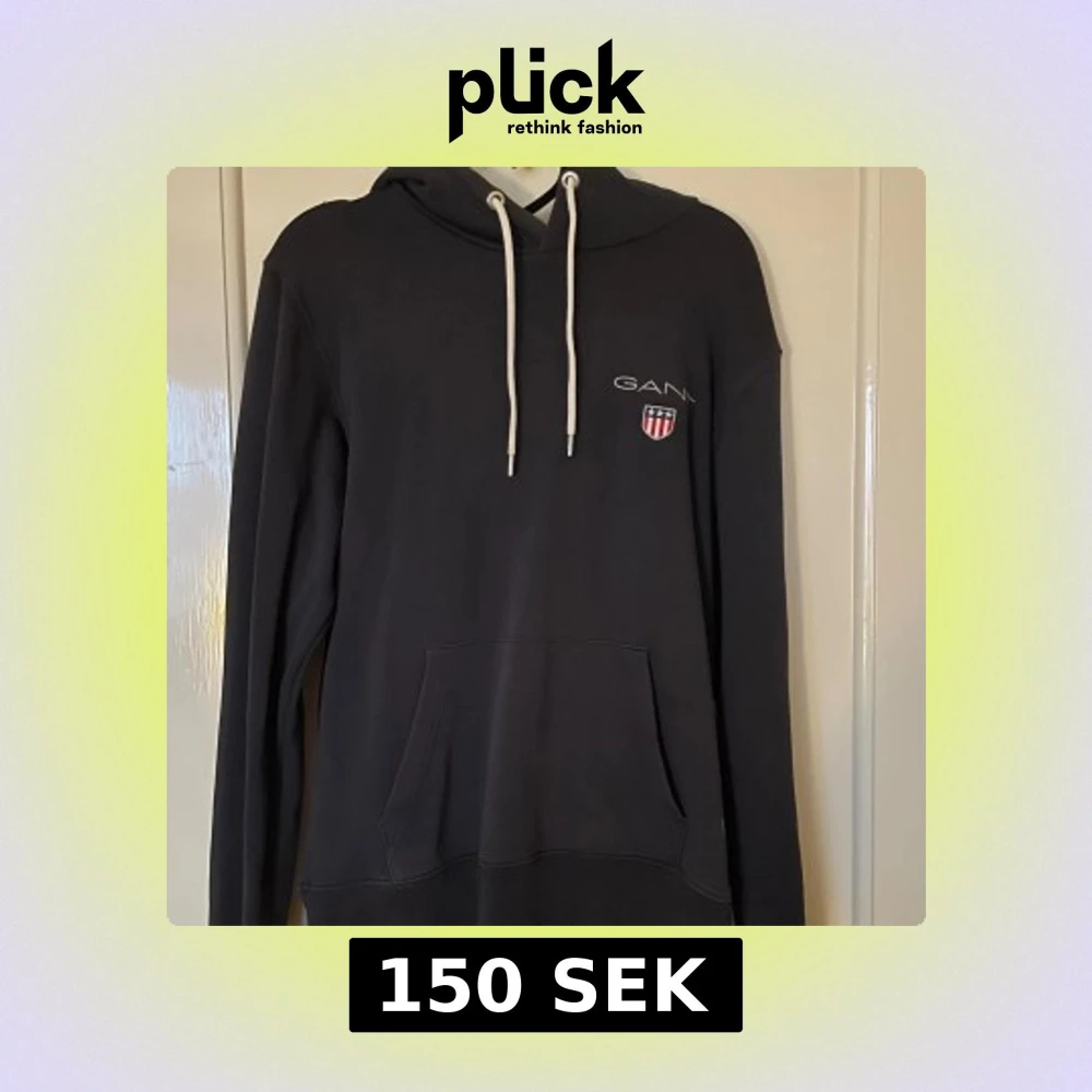 Svart hoodie från GANT med vit snörning och broderad logga på bröstet. Tröjan har en klassisk känguruficka framtill och mjukt material i bomull. Varan är i använd i bra skick, men är nopprig på båda axlarna. Säljs i befintligt skick.
