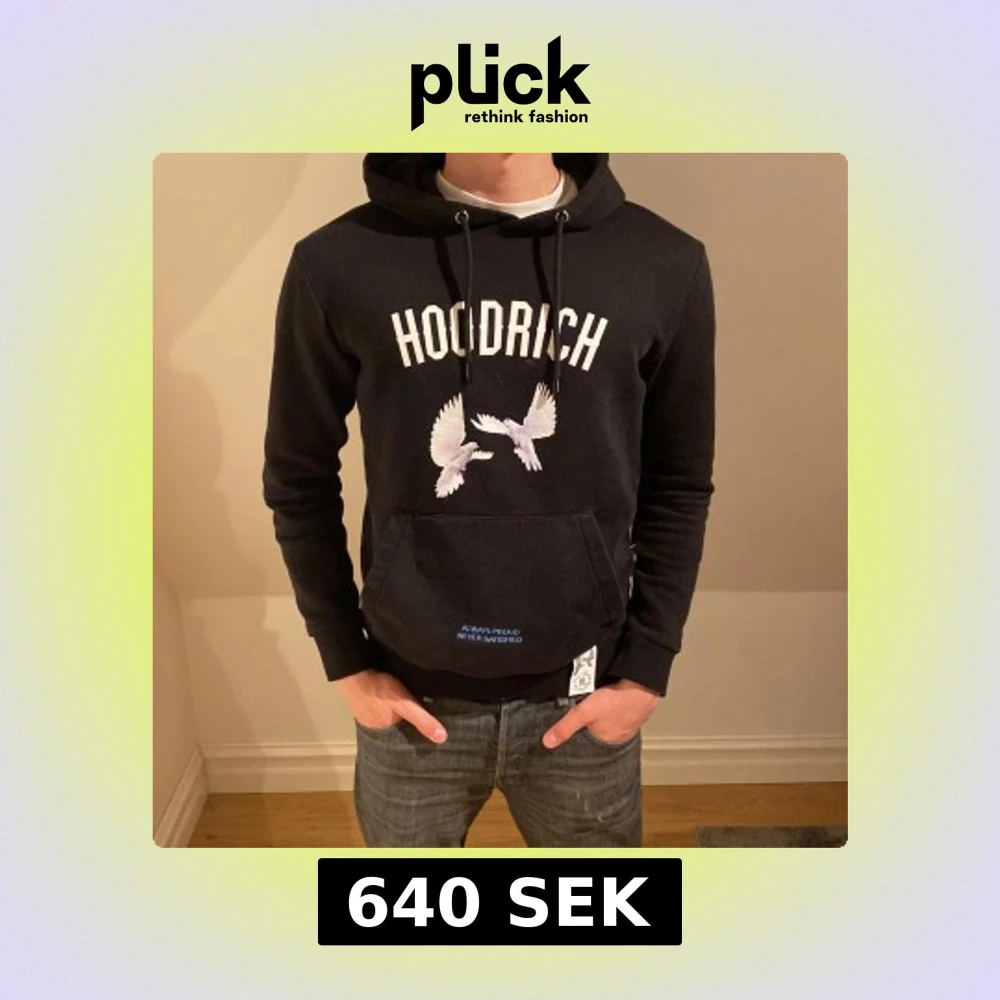 Säljer en svart hoodie från Hoodrich med tryck av vita fåglar och text både fram och bak. Hoodien har en känguruficka och justerbar huva med snören. Perfekt för en avslappnad stil. Tröjan var limited edition och säljs inte längre. Modellen är 183 och det står att tröjan är XS men väger mer åt S/M pris är diskuterbart👍