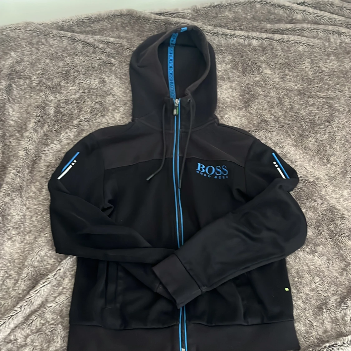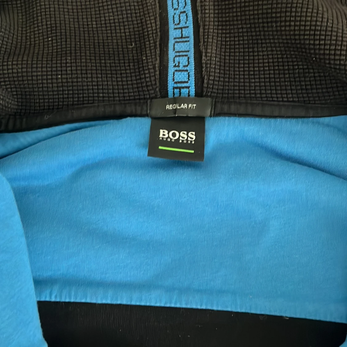 Snygg svart hoodie från Hugo Boss med blå detaljer och dragkedja. Den har en broderad logga på bröstet och en huva med snörning. Perfekt för en stilren och bekväm look.