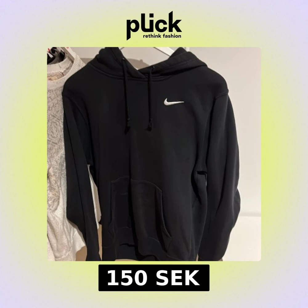 Säljer en klassisk svart hoodie från Nike med den ikoniska loggan på bröstet. Tröjan har en justerbar huva med dragsko och en stor magficka framtill.