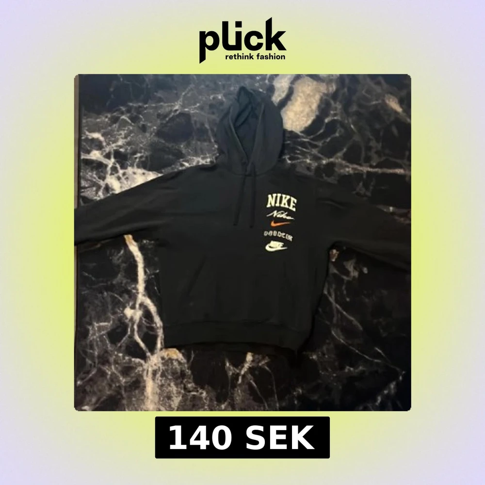 Säljer en svart hoodie från Nike med flera vita loggor och tryck på bröstet. Tröjan har huva med dragsko och ribbade muddar vid ärmslut och nederkant. Perfekt för en sportig och avslappnad stil.