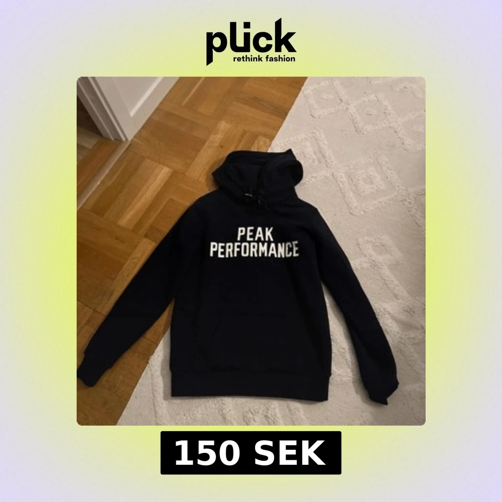 Säljer en svart hoodie från Peak Performance med vit text på bröstet. Klassisk modell med huva och dragsko, samt ribbade muddar vid ärmslut och nederkant. Perfekt för en avslappnad stil.