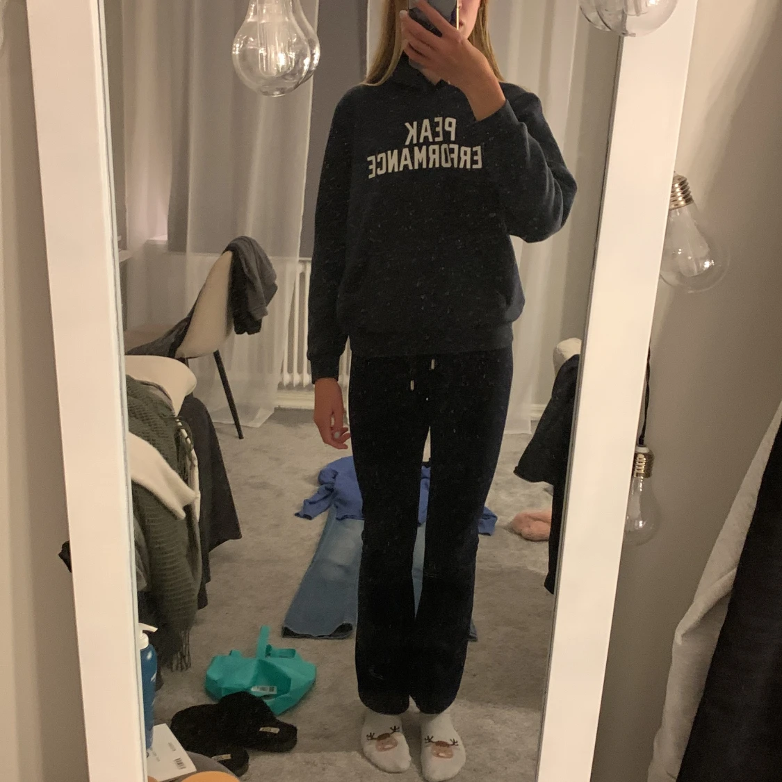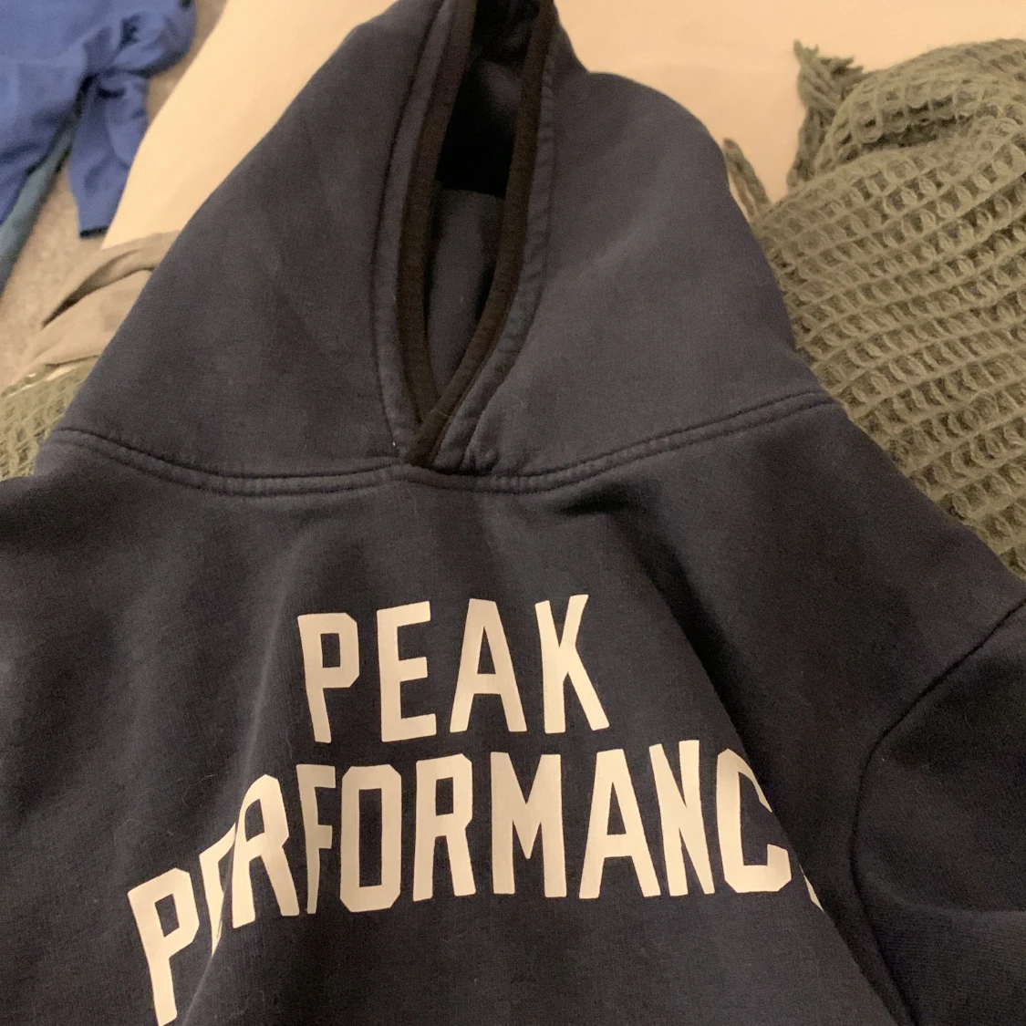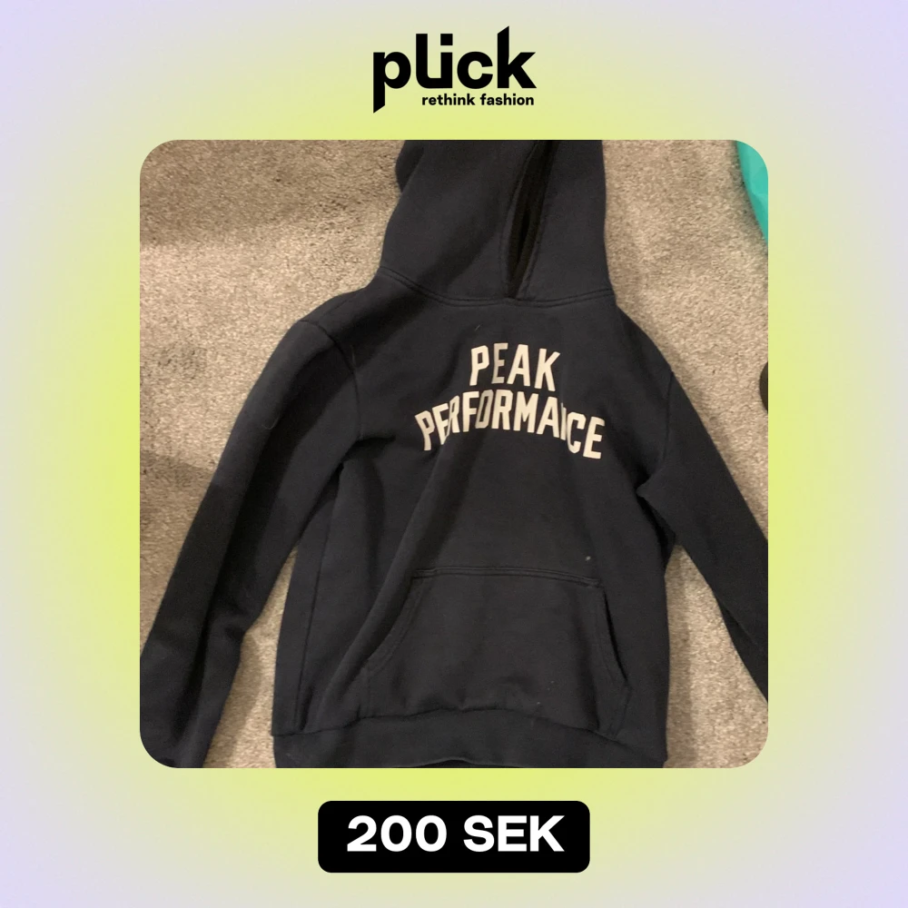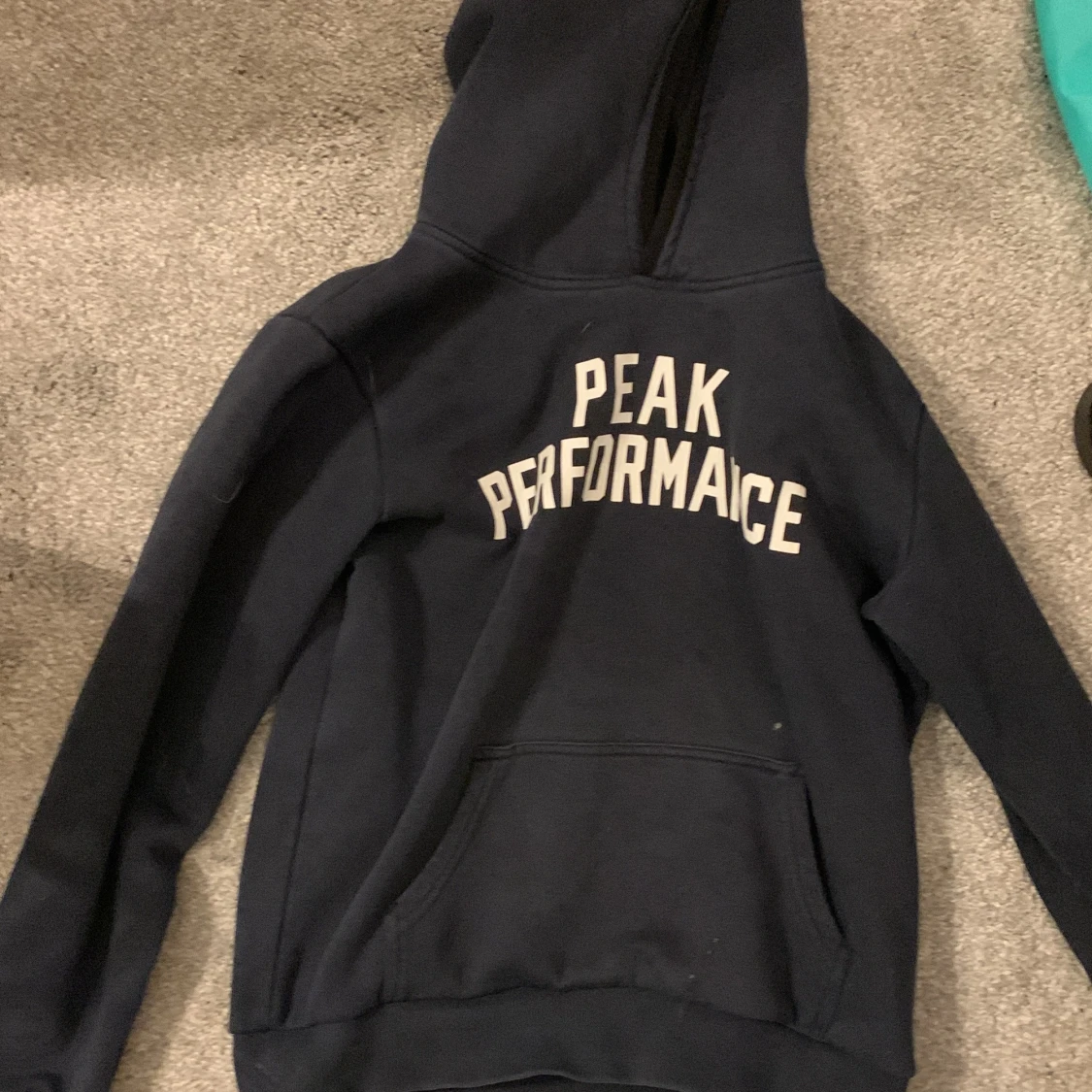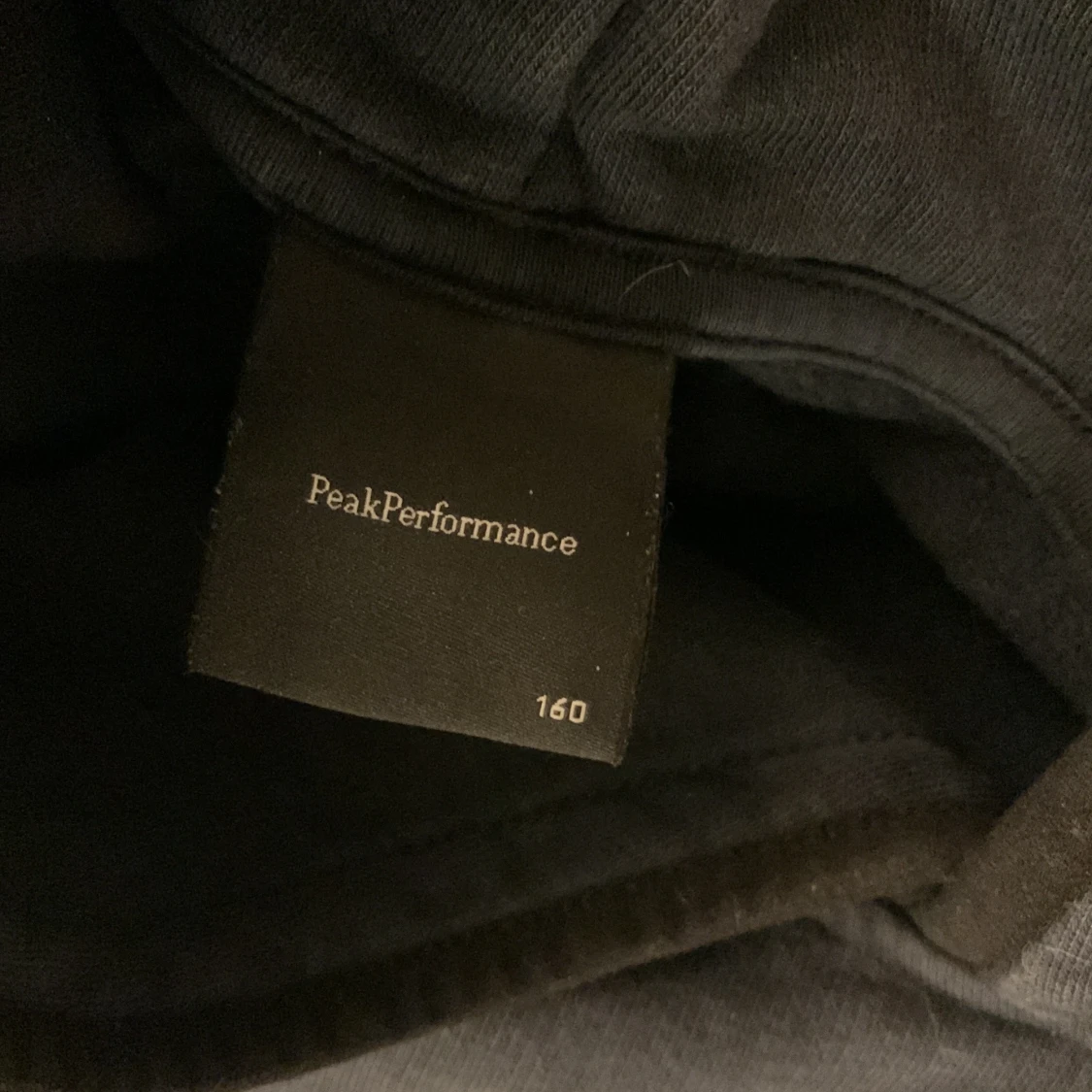 Säljer en svart hoodie från Peak Performance i bra skick och storlek 160. Den har en klassisk design med vit text på bröstet och en bekväm passform. Perfekt för höst och vinter, och funkar lika bra till vardags som till träning. Fläckarna på magen går säkert bort i tvätten men det är inget som garanteras❤️