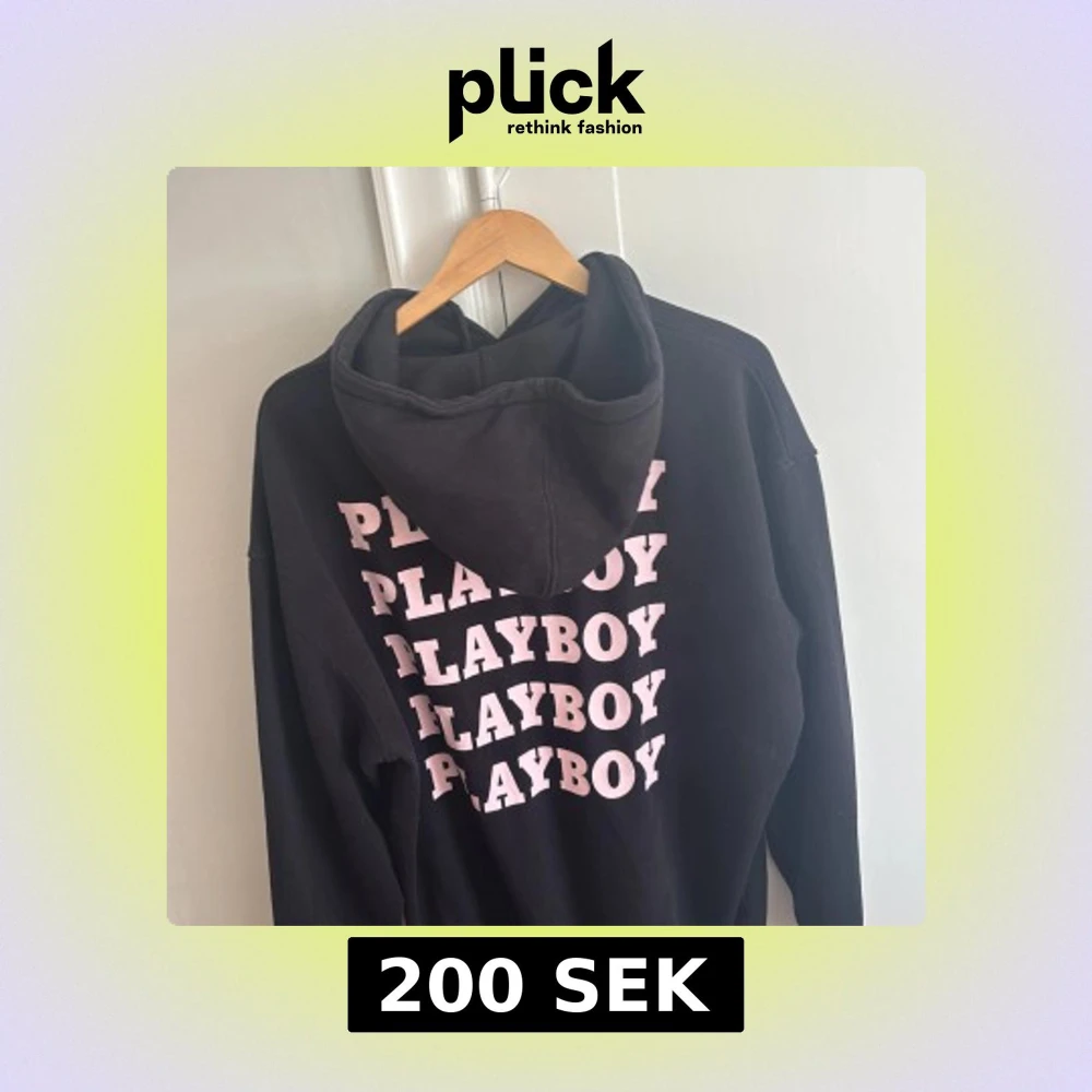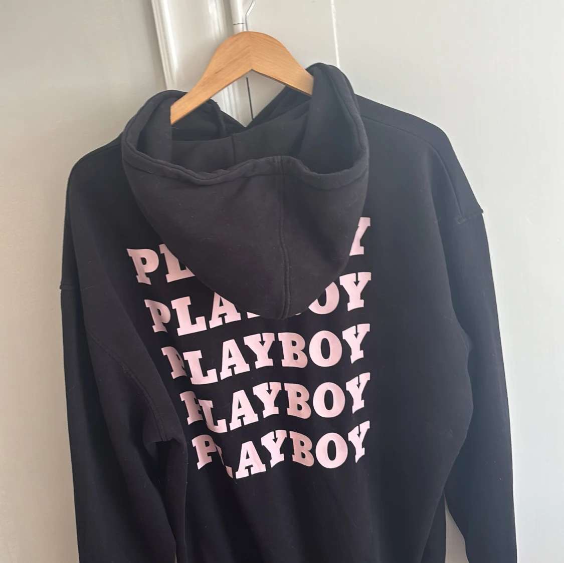 Svart hoodie med stor huva och tryck i rosa text på ryggen. Den är stor i storleken, jag har vanligtvis S och passar.