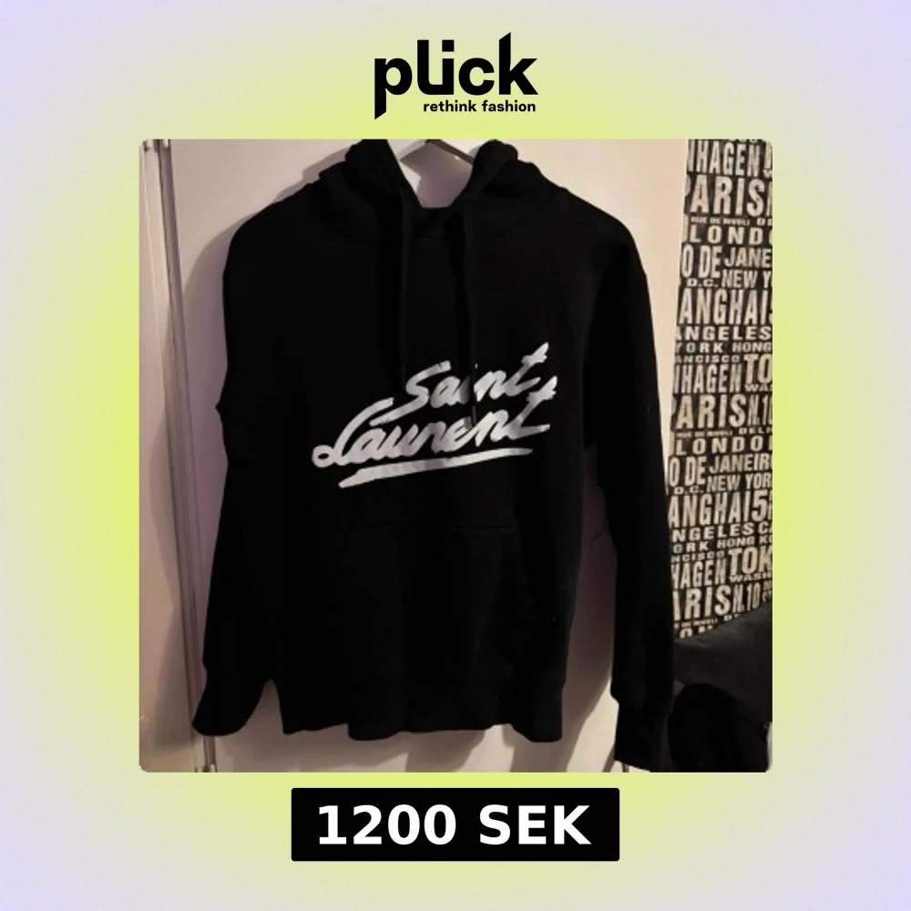 Säljer en snygg svart hoodie från Saint Laurent med deras logga på framsidan. Säljer då den är för liten för mig. Bra skick förutom ett litet hål på längst nere på armen. Skriv för frågor!