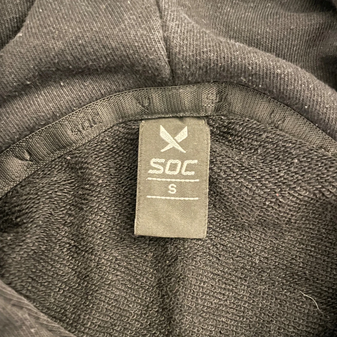 Svart hoodie från SOC i storlek S. Tröjan har en klassisk huva med snörning och långa ärmar med ribbade muddar. Perfekt för chill eller träning, tillverkad i mjuk bomullsmix som är skön mot huden.