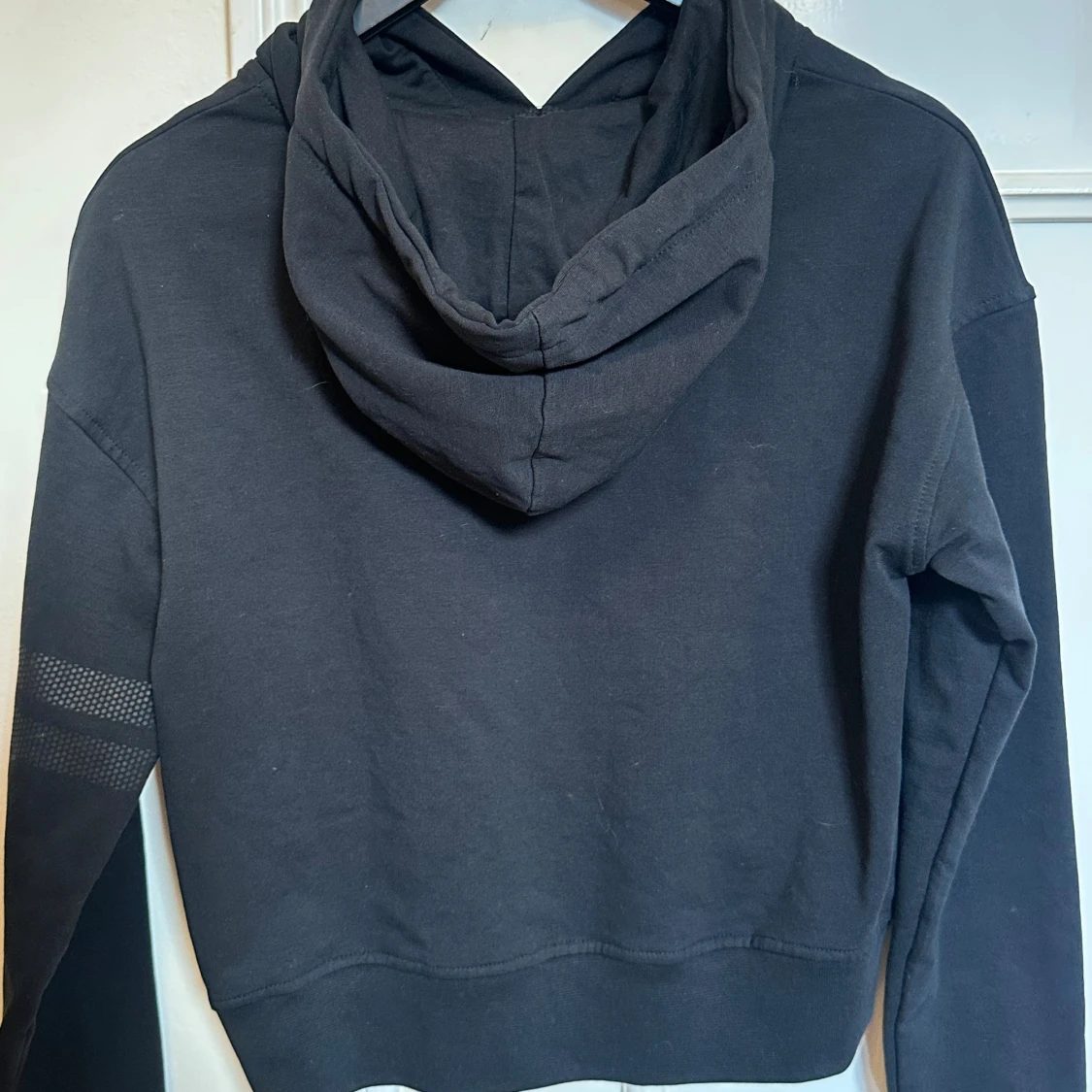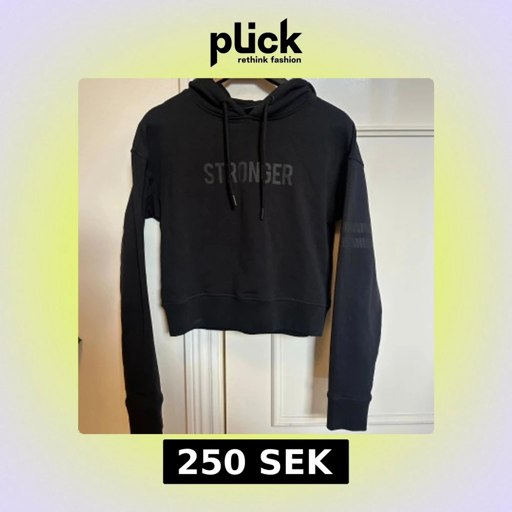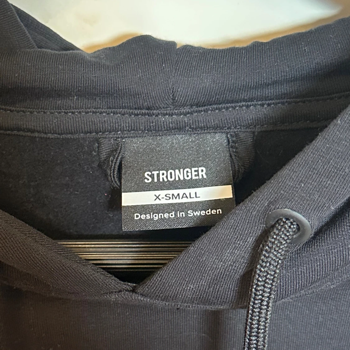 Svart croppad hoodie från Stronger med tryckt logga på bröstet och snörning i huvan. Långa ärmar med diskreta ränder på ena ärmen. Perfekt för chill eller träning, mjukt material och relaxed fit. Pris kan diskuteras!